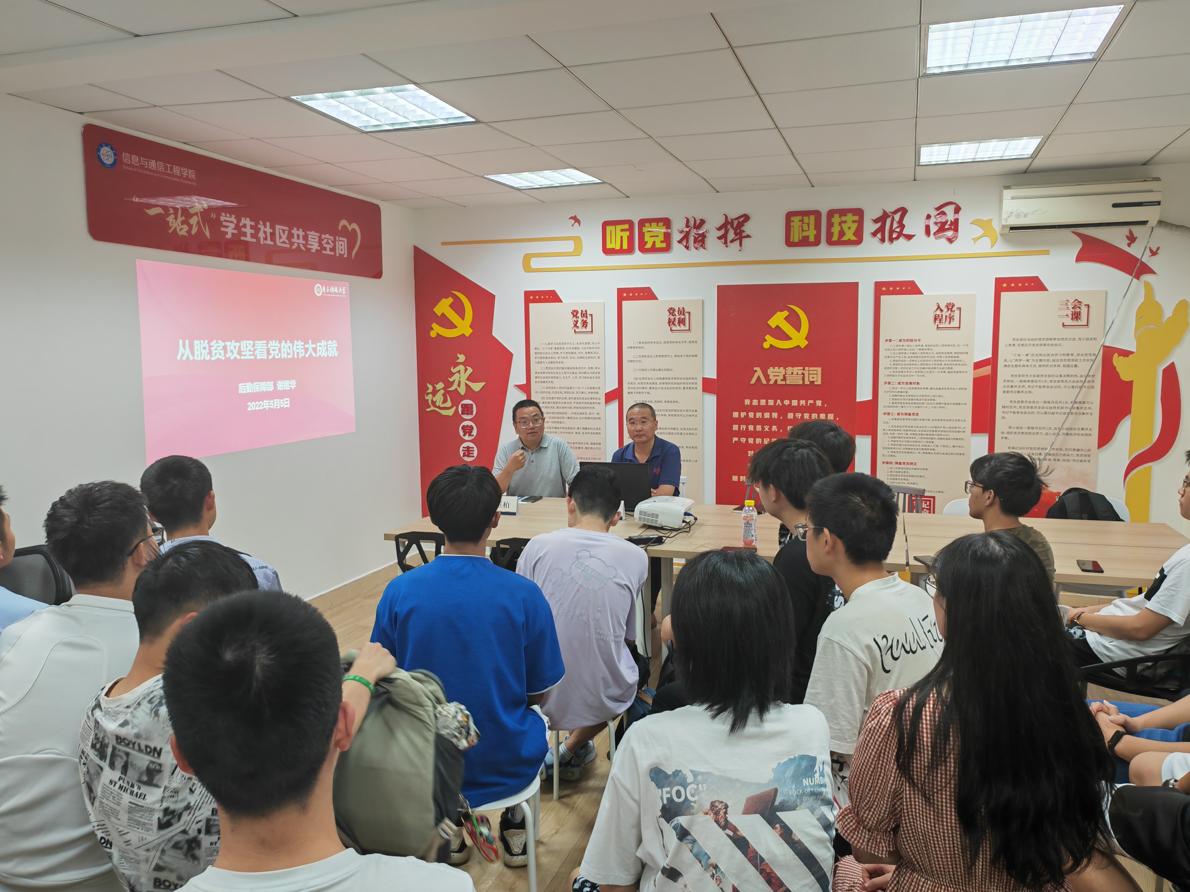 2022.05.27为了迎接党的二十大胜利召开,积极营造喜迎党的二十大的浓厚氛围,激励支部成员自觉从党的重大成就和历史经验中汲取丰富智慧和奋进力量,2022年5月8日15时,新葡的京集团35222vip电子工程系研究生第二、四党支部联合网络工程系研究生第四党支部共同在图书馆前开展了以“青春献礼二十大,强国有我新征程”为主题的党日活动。此次活动还特别邀请到了党员教师郭世盛老师参与,活动由三位支部书记——孔昱凯同志、李文欣同志、薛擎宇...