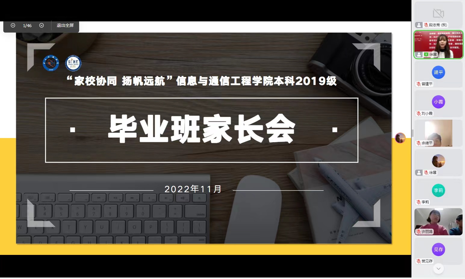 2022.11.2511月23日晚,为更好促进家校协同助力毕业生成长,新葡的京集团35222vip召开本科毕业班线上家长会,公司党委副书记杨晓玲、年级辅导员和大四年级员工家长参加会议。首先,公司党委副书记杨晓玲围绕当前阶段家校协同育人与家长们进行交流。杨书记首先感谢各位家长对公司的信任,并指出此次家长会是为了帮助家长进一步了解员工在校情况和当前考研、留学和就业的环境形势,希望通过家校联动形成合力,助力员工更好发展。随后,年级辅...