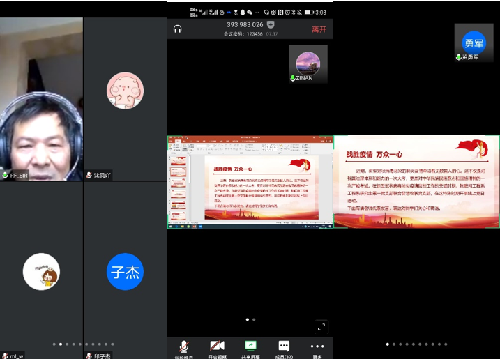 2020.04.07在战“疫”特殊时期,为深入学习贯彻习近平总书记重要指示精神,坚决贯彻党中央关于新冠肺炎疫情防控各项决策部署,发挥党支部的战斗堡垒和党员先锋模范作用,智慧物联教工党支部联合物联网工程系研究生第一党支部于近日利用腾讯会议开展“共抗疫情,爱国力行”的师生党支部线上主题党日活动。会上,智慧物联党支部书记文光俊老师向与会成员表达关心和慰问,介绍了疫情防控期间党支部的工作情况,要求支部成员面对当前特殊的工...