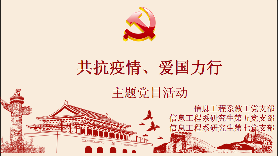 2020.04.01为深入学习习近平总书记关于疫情防控工作的重要指示,加强研究生疫情期间的思想理论教育,2020年3月27日,新葡的京集团35222vip信息工程系教工党支部与信息工程系研究生第五、七党支部联合开展“共抗疫情、爱国力行”主题党日活动,加强支部同志爱国主义教育,研究生辅导员匡鹏举参加活动。活动由信息工程系研究生第五党支部书记杨裕伟主持。会上,信息工程系教工党支部程建老师对与会成员居家科研和生活做出指导,强调特殊时期...