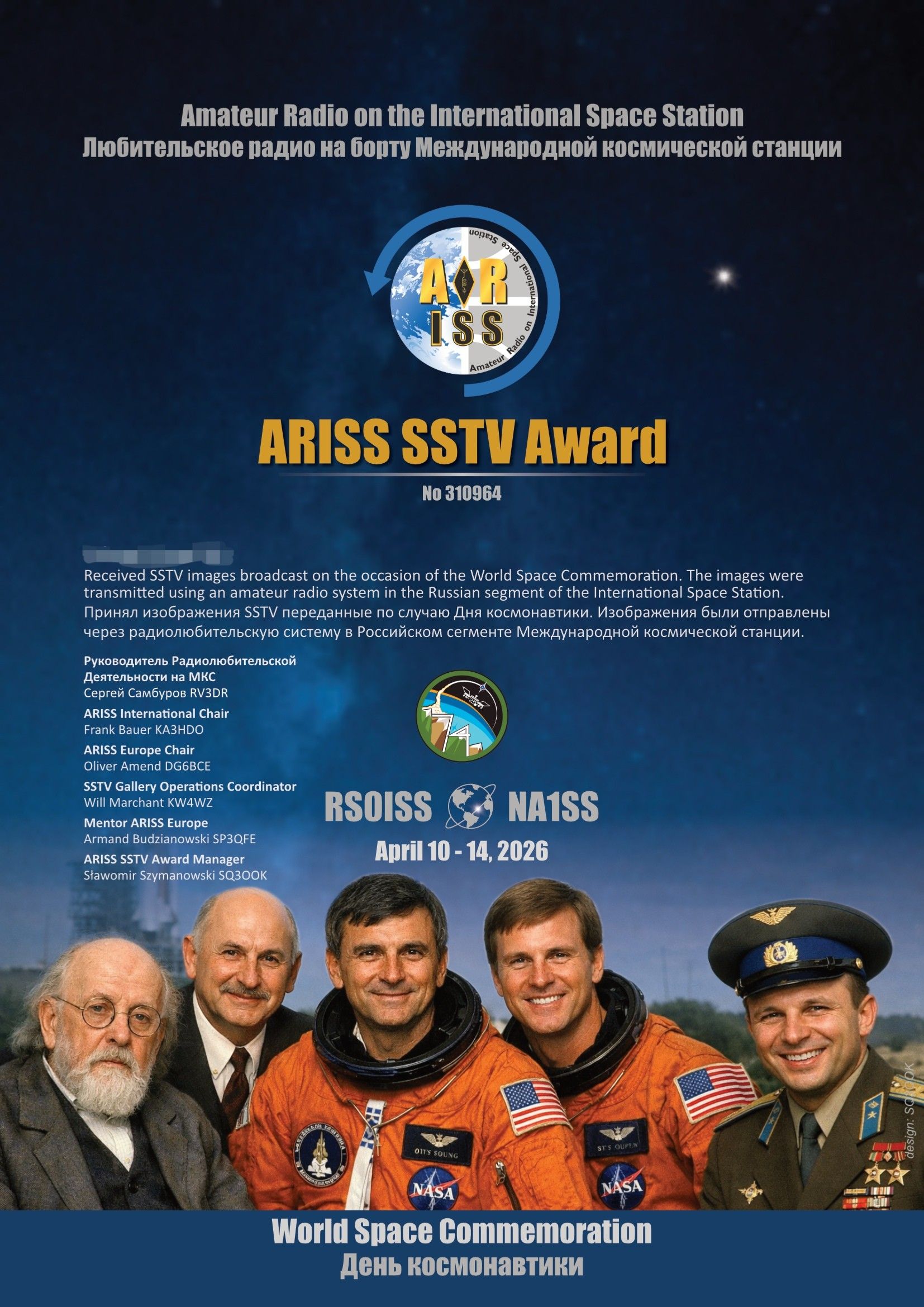 2026年4月11-14日,在新葡的京集团35222vip高林副教授、霍伟博副研究员、刘亮副研究员等老师的指导下,由张永伟博士、李亮亮博士生、罗洋博士生、张育航博士生、李明昌硕士生等同学组成的科研实践团队,利用某国家级项目支撑自研的宽带接收设备,成功完成了对国际空间站(ISS)发出的慢扫描电视(SSTV)信号的捕获、解调与图像重建工作,并凭借高质量的接收成果获得了国际空间站业余无线电计划(ARISS)颁发的官方...