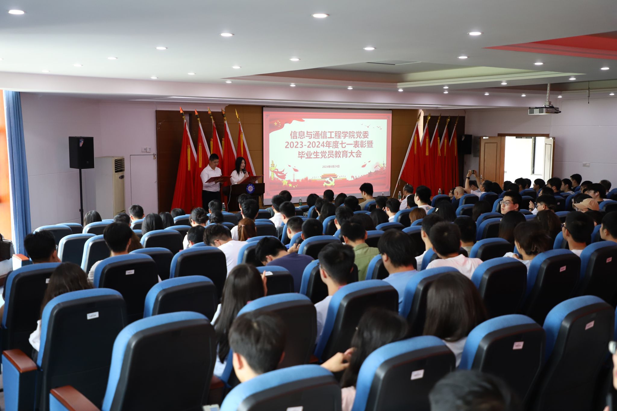 2024.06.276月25日,信息与通信工程公司党委召开2022-2023年度七一表彰暨毕业生党员教育大会,信通党委委员及师生党员代表参加大会。大会伊始,随着庄严的音乐响起,全场肃立,齐声高唱《国际歌》。公司党委书记冷甦鹏在致辞中指出,今年是中国共产党成立103周年,是实现“十四五”规划目标任务的关键一年。同时对过去一年信通党委带领公司和重点实验室在各项工作中取得的突出成果进行总结回顾,并对即将毕业的党员同学提出了三点希望:一...