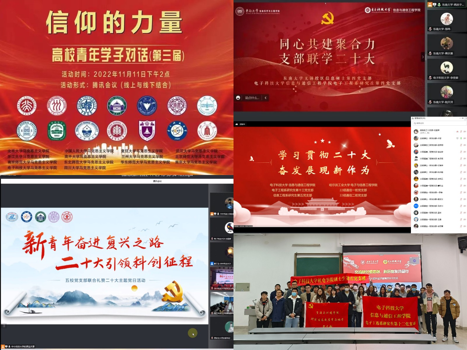 物联网工程系研究生第三党支部先后与计算机科学与工程公司(网络空间安全公司)党委3个研究生党支部、智慧物联教工党支部举办“学习二十大,奋进新征程”联合党日活动。中共四川省委党校(行政公司)区域经济教研部副主任贾舒教授、计算机公司党委副书记李青、成都中医药大学附属医院医联体管理中心主任张娜和智慧物联教工党支部书记文光俊结合自身岗位,以不同视角解读二十大报告内容,激励同学们为实现中国式现代化勇毅前行;全国高校优秀思想政治理论课名师罗大明教授为师生党员作“科教兴国战略、人才强国战略、创新驱动战略”专题报告。