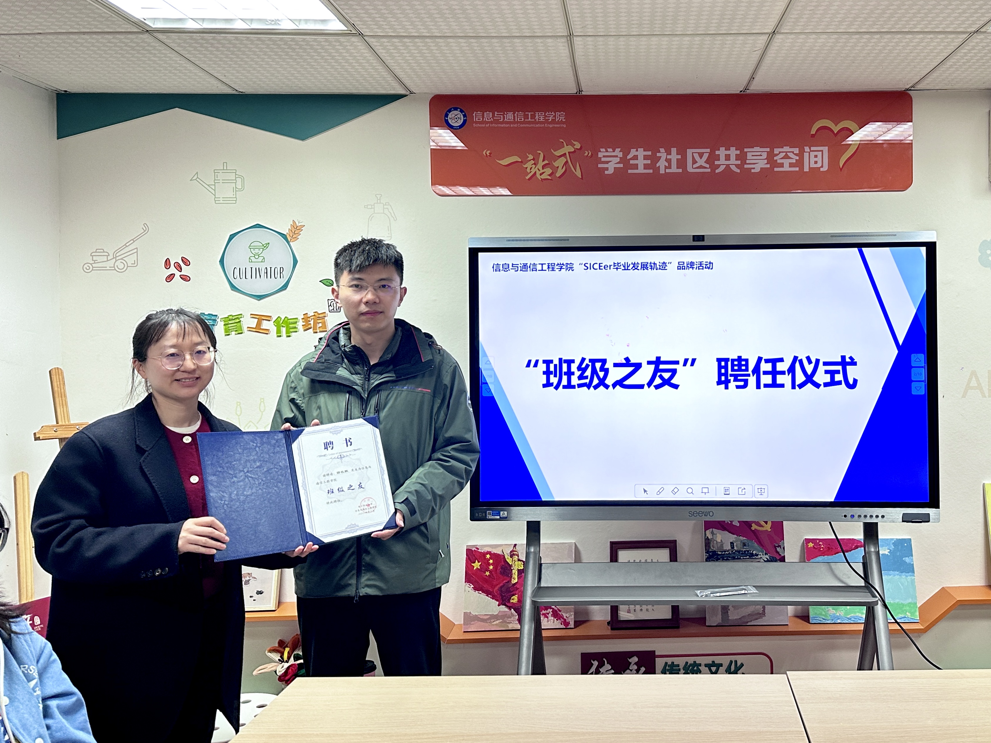 公司员工科科长江倩参加活动,颁发“班级之友”聘书。