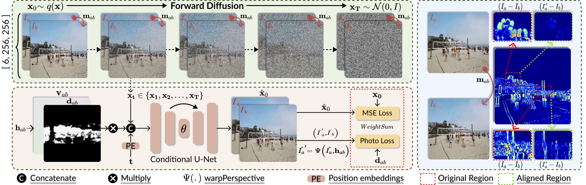 图 3:DGM的示例图,在训练过程中,给定一对相邻帧和它对应的为标签条件,我们利用扩散模型来实现数据的生成,此间我们引入图像损失和重建损失。
