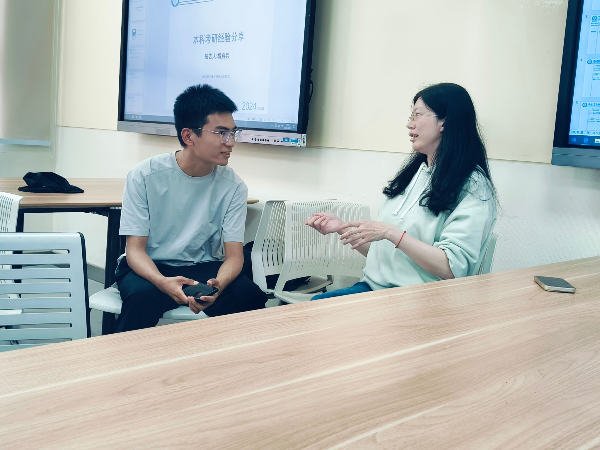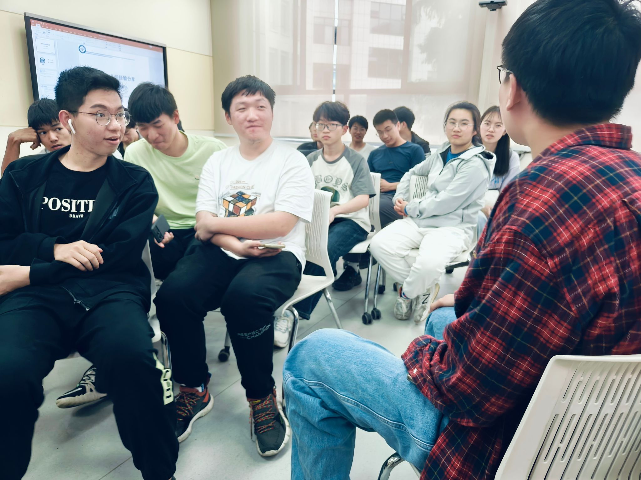 交流环节,陈老师和学长们与同学们亲切交流,耐心解答了同学们的各种疑问,辅导员李烁也参与到讨论当中,鼓励积极地去发掘自己的潜在优势,自信地过好老员工活。