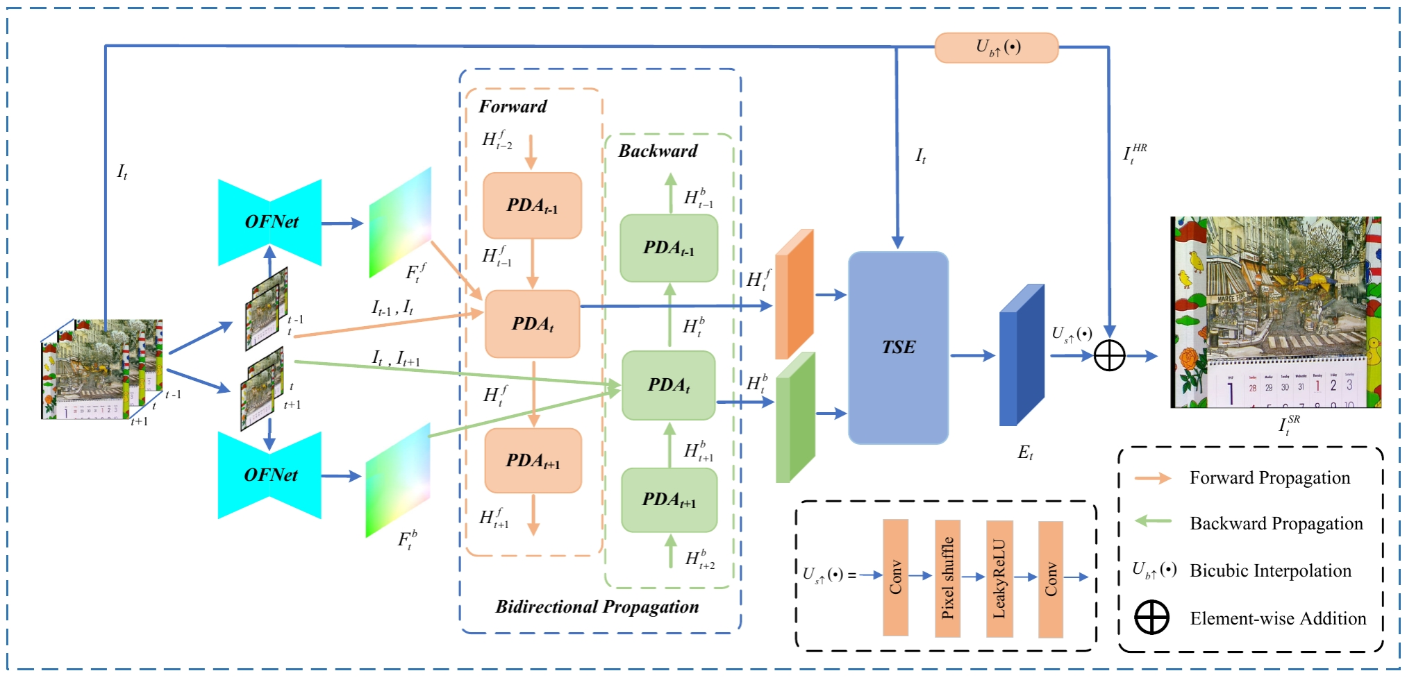 图1:DVSRNet整体框架的展示:OFNet是轻量化光流网络,PDA是渐进式可变形对齐模块,TSE是时序稀疏增强模块。团队搭建了一套基于光流网络和超分辨率网络联合训练的端到端深度网络框架。