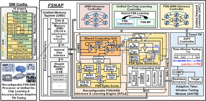 传统的人工神经网络(ANN)是人脑高度简化的数学抽象,使用连续的幅度表示信息,尽管准确率很高,但是需要大量的乘加运算,因此能耗很大。脉冲神经网络(SNN)仿照了人脑事件驱动的机制进行计算,使用稀疏脉冲串的频率和发放时间来表示不同的信息,具有计算量低,能耗低的特点。现有的类脑计算芯片主要有几个问题:1. 几乎都基于泄露-积分-发射(LIF)神经元,这种神经元的编码效率很低,通常需要很大的编码时间窗,发放很多的脉冲才能达到很高的准确率,这会增加能耗和时延。2. 仅支持固定编码时间窗来进行前向推理,适应性较差,能效较低。3. 仅支持单一的SNN学习方式(基于脉冲的反向传播和ANN到SNN转换的方法),缺乏针对不同应用的适应性。针对以上问题,团队设计了超低能耗的FSNAP芯片(图),该芯片具有可重构的SNN推理和学习架构,支持跳时间步脉冲累加技术以及并行的脉冲发放技术,从而实现高能效、低延时。同时,我们提出了一种准确率驱动的自适应调窗技术来进一步降低能耗、时延同时保持高准确率。此外,我们设计了统一的在线学习架构,支持3种在线学习模式,从而增加芯片针对不同应用的适应性。我们的芯片采用55nm制造,与现有的先进设计在相同或相似的任务上相比,能效和加速比都显著提高。