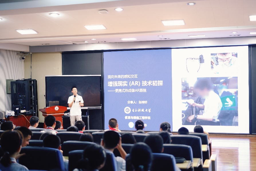 在科普环节,公司科协成员带着便携式热成像 AR 眼镜、超声波音响等科创作品亮相,两位同学用通俗易懂的语言讲解原理。课后,初中生们踊跃体验 AR 眼镜,在互动中感受科技魅力,不少同学围着 “小老师” 追问原理,眼中闪烁着对科学的好奇与向往。