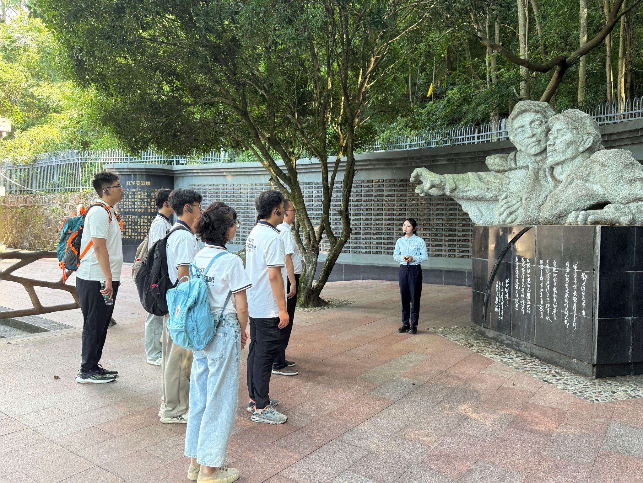 上午,师生一行怀着崇敬的心情来到红军山烈士陵园,沿着316级台阶缓缓上行,每一级台阶都仿佛承载着革命先烈的初心与使命,教师宣讲团成员蒋迪教授结合台阶两侧所刻画的历史事件,为同学们讲述红军长征的动人故事。