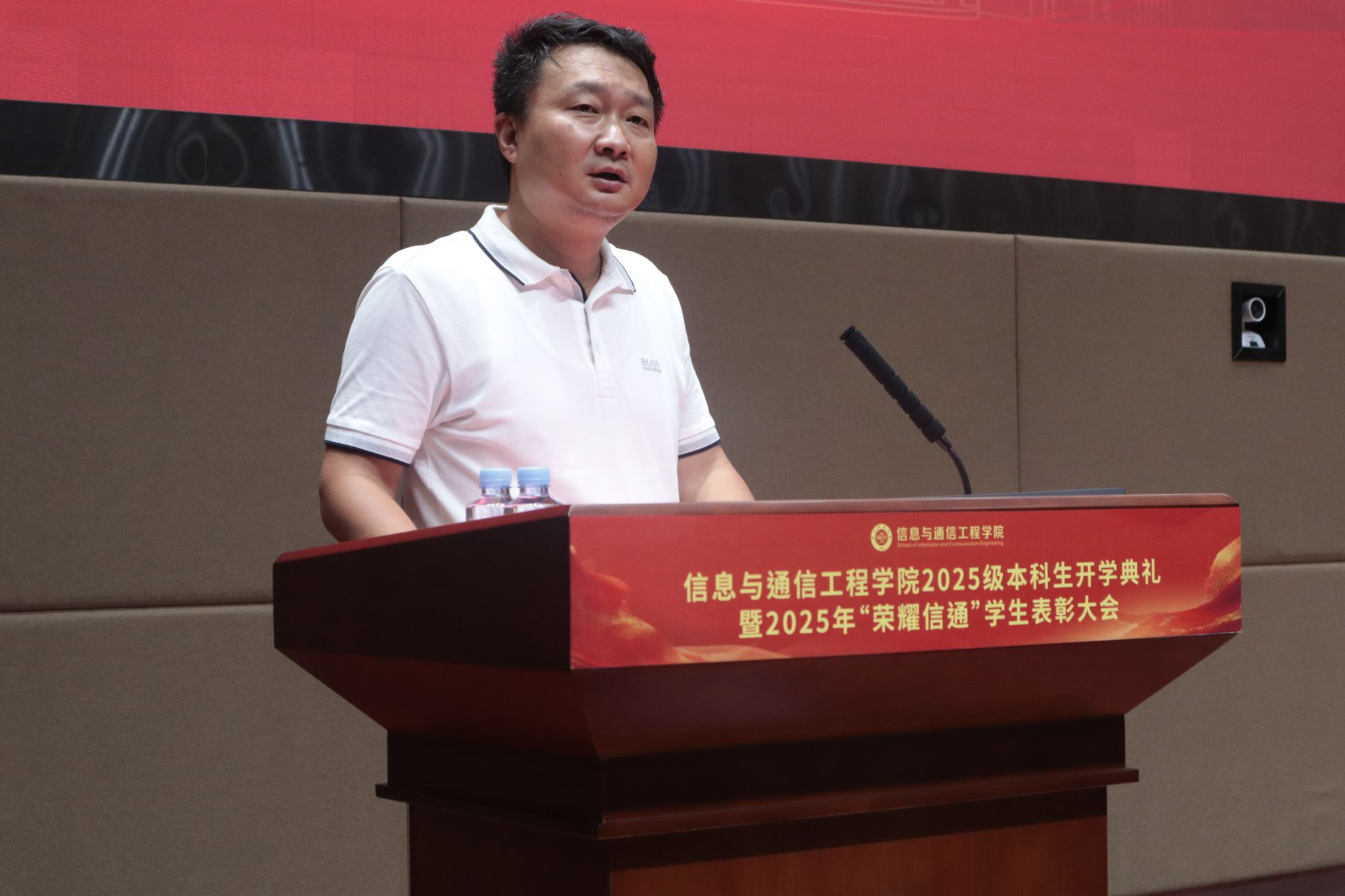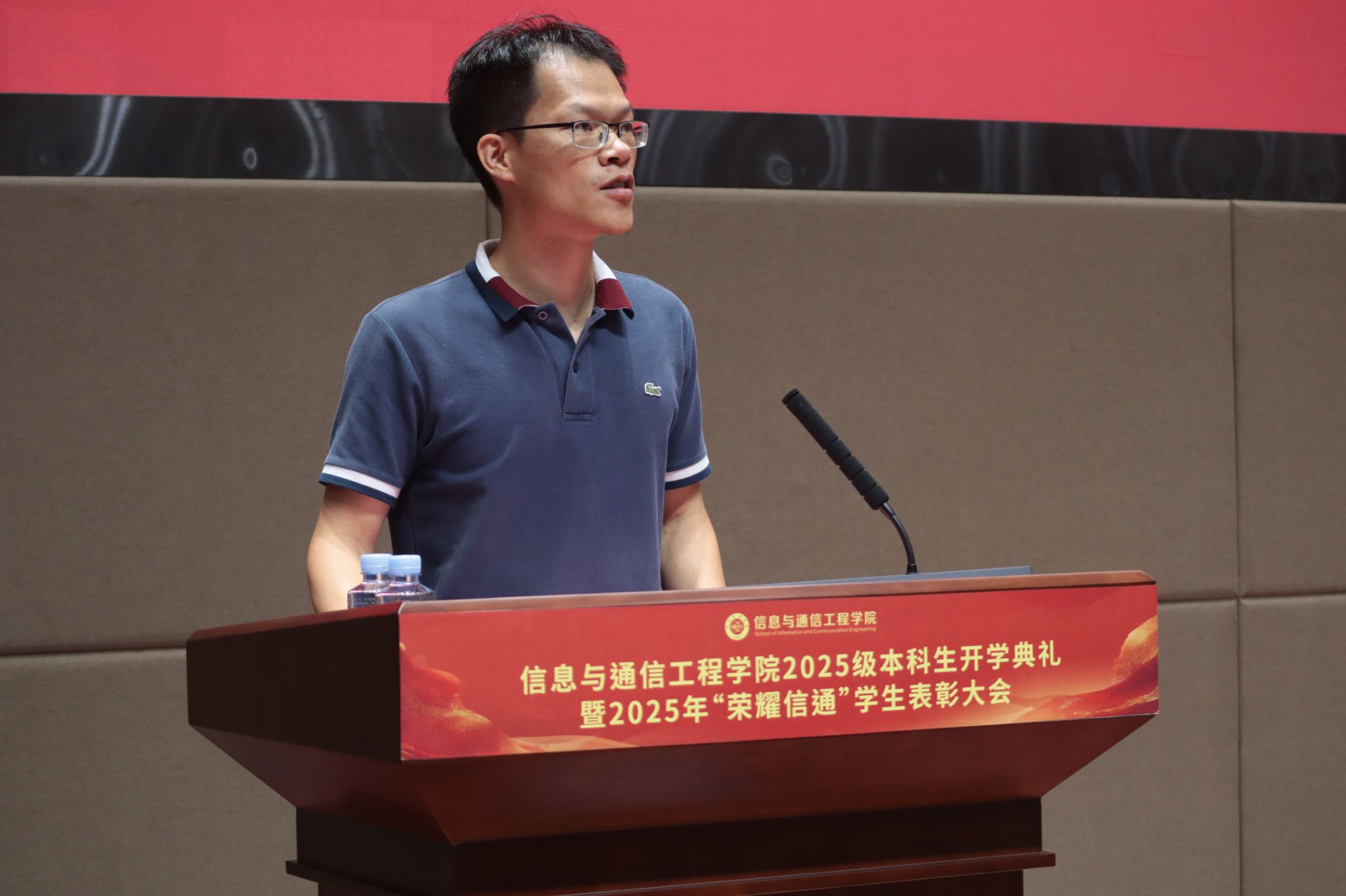 黄钰林经理在致辞中向新加入信通大家庭的499名同学表示热烈欢迎和祝贺,并以“不要等看见机会再准备”为主题,鼓励全体新生主动积累、提早规划。他通过一家坚持清晨五点开门的咖啡馆的故事,强调真正的成功属于那些在无人注视时依然默默努力的人。黄经理向同学们提出四点建议:一是深耕专业,筑牢基础,认真对待每一门课程和每一次实验;二是跨界学习,拓展能力维度,主动涉猎不同领域的知识和技术;三是重视实践,从大一起积极参与各类活动,积累真实经验;四是修身养性,培养健全人格与良好习惯。他勉励大家,大学是一段需要全心投入的旅程,今天的每一分准备都将成为未来把握机遇的底气。黄经理殷切期望同学们珍惜时光、早做准备,以扎实的专业能力和综合素养成就自我,为国家科技发展贡献新一代信通人的力量。