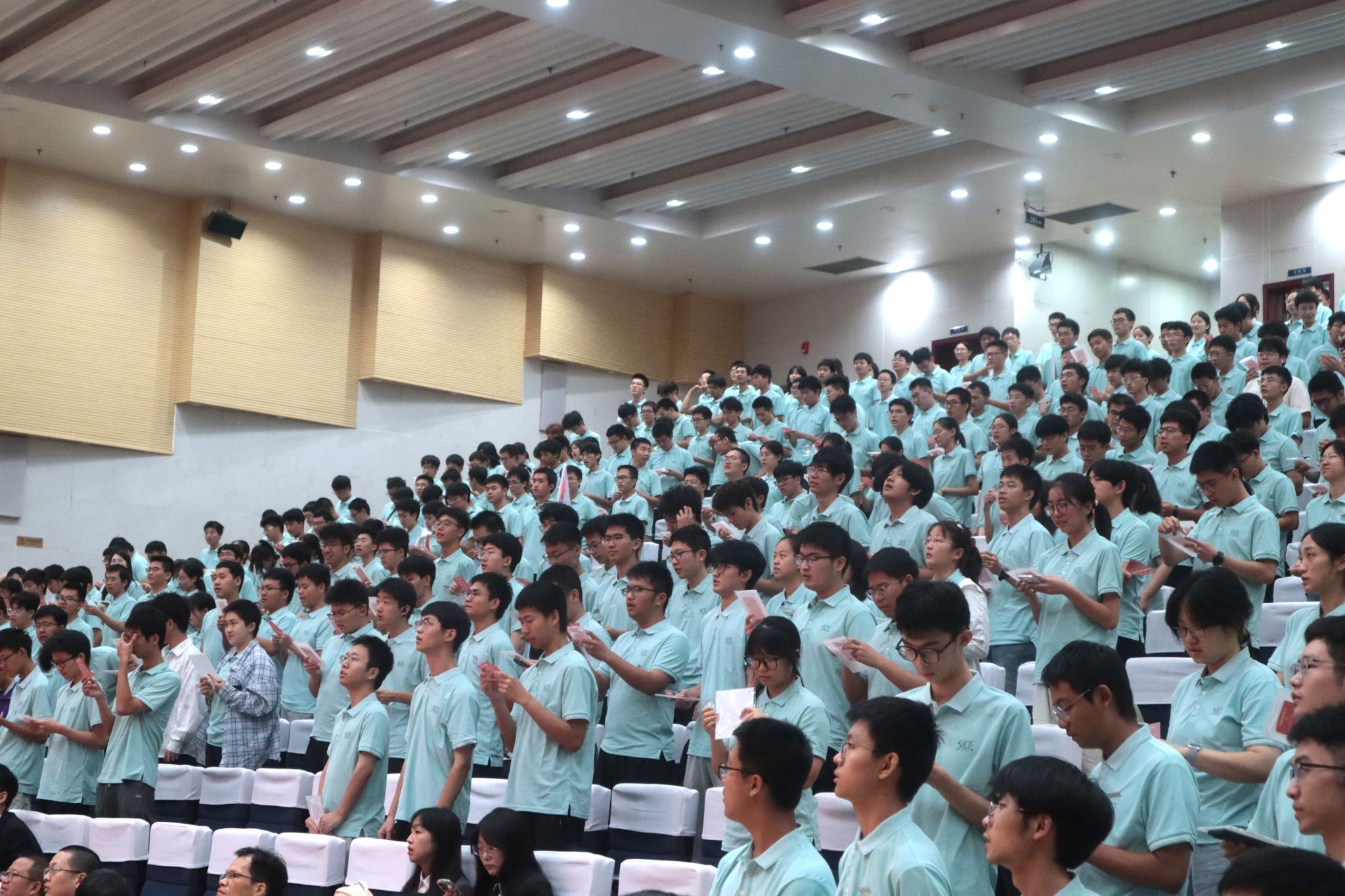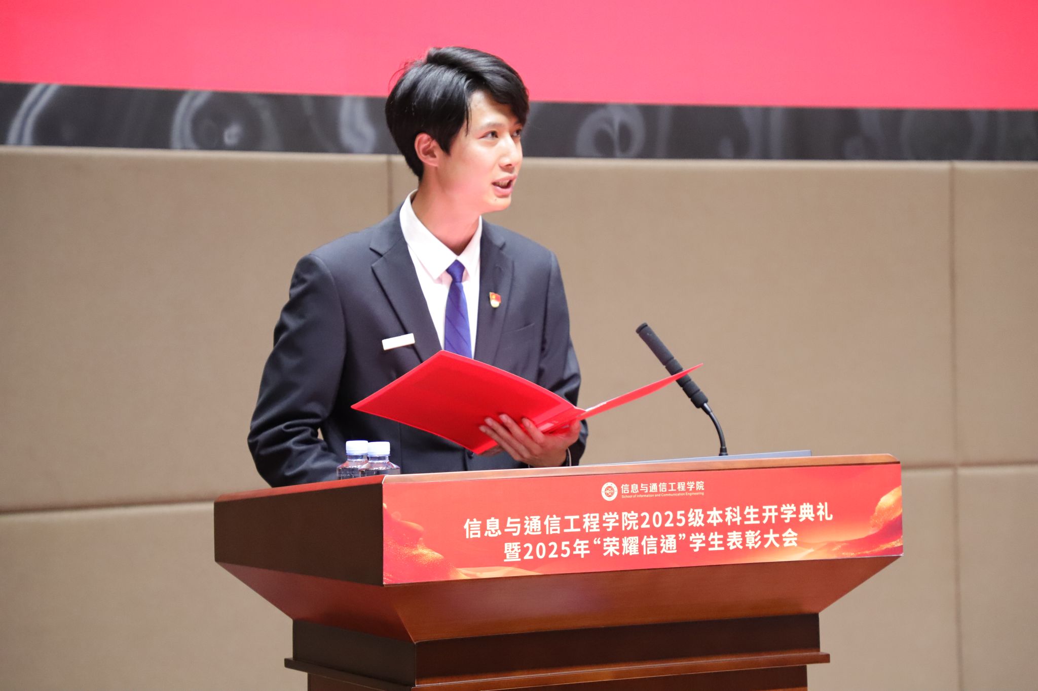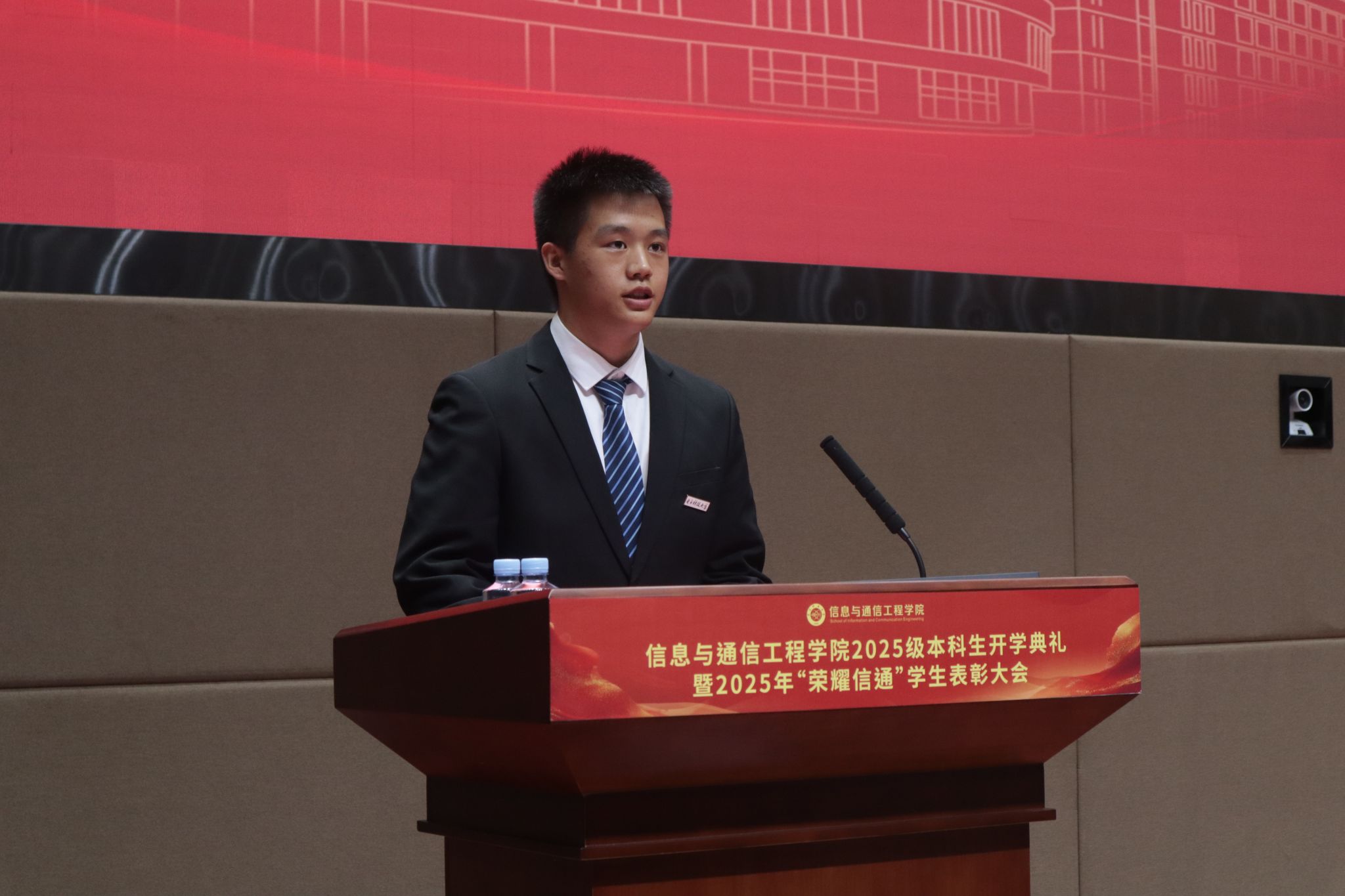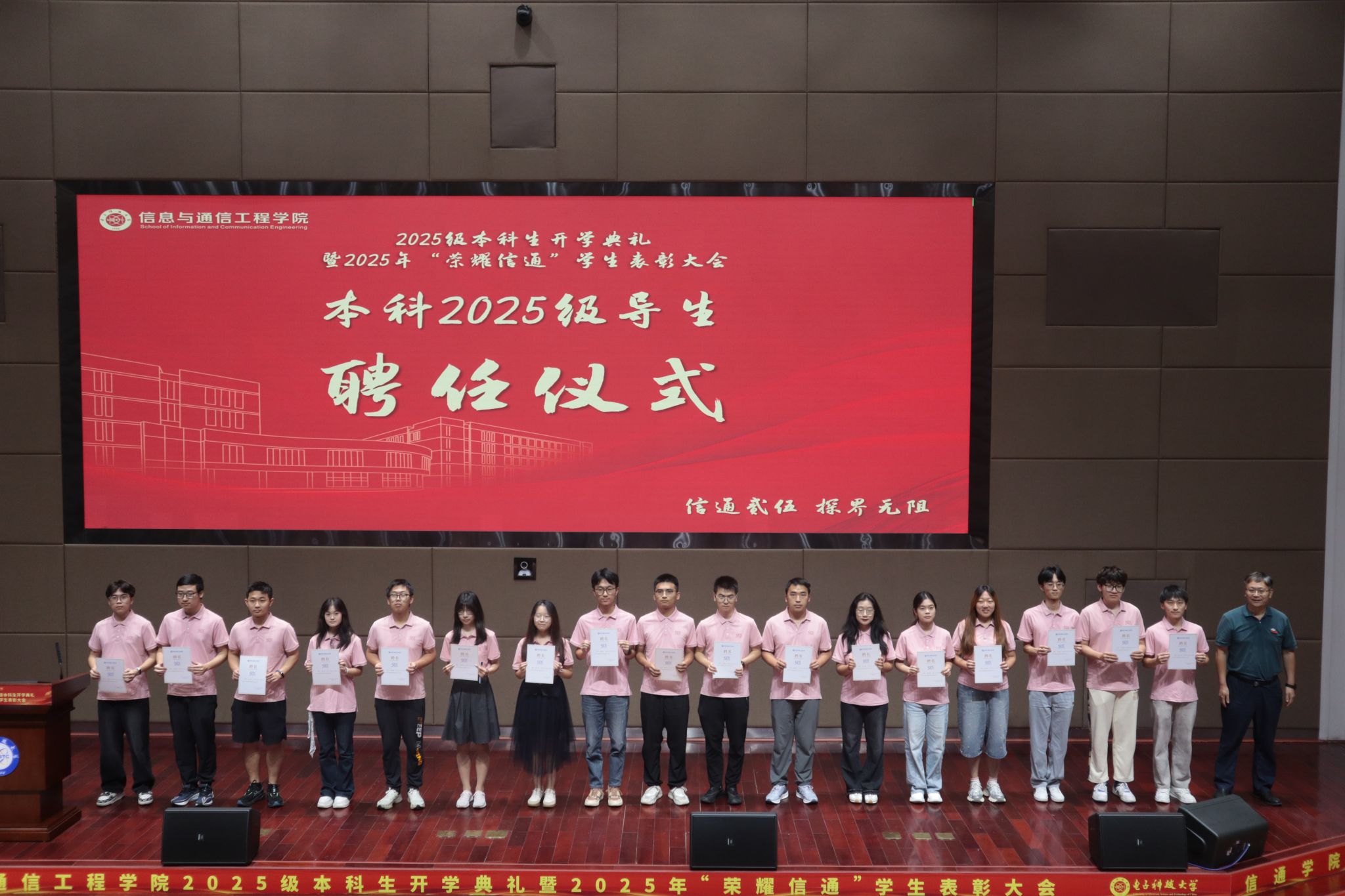 典礼在庄严的国歌声中拉开帷幕,全场师生肃立齐唱,用激昂的歌声传递出新一代信通人的使命与担当。