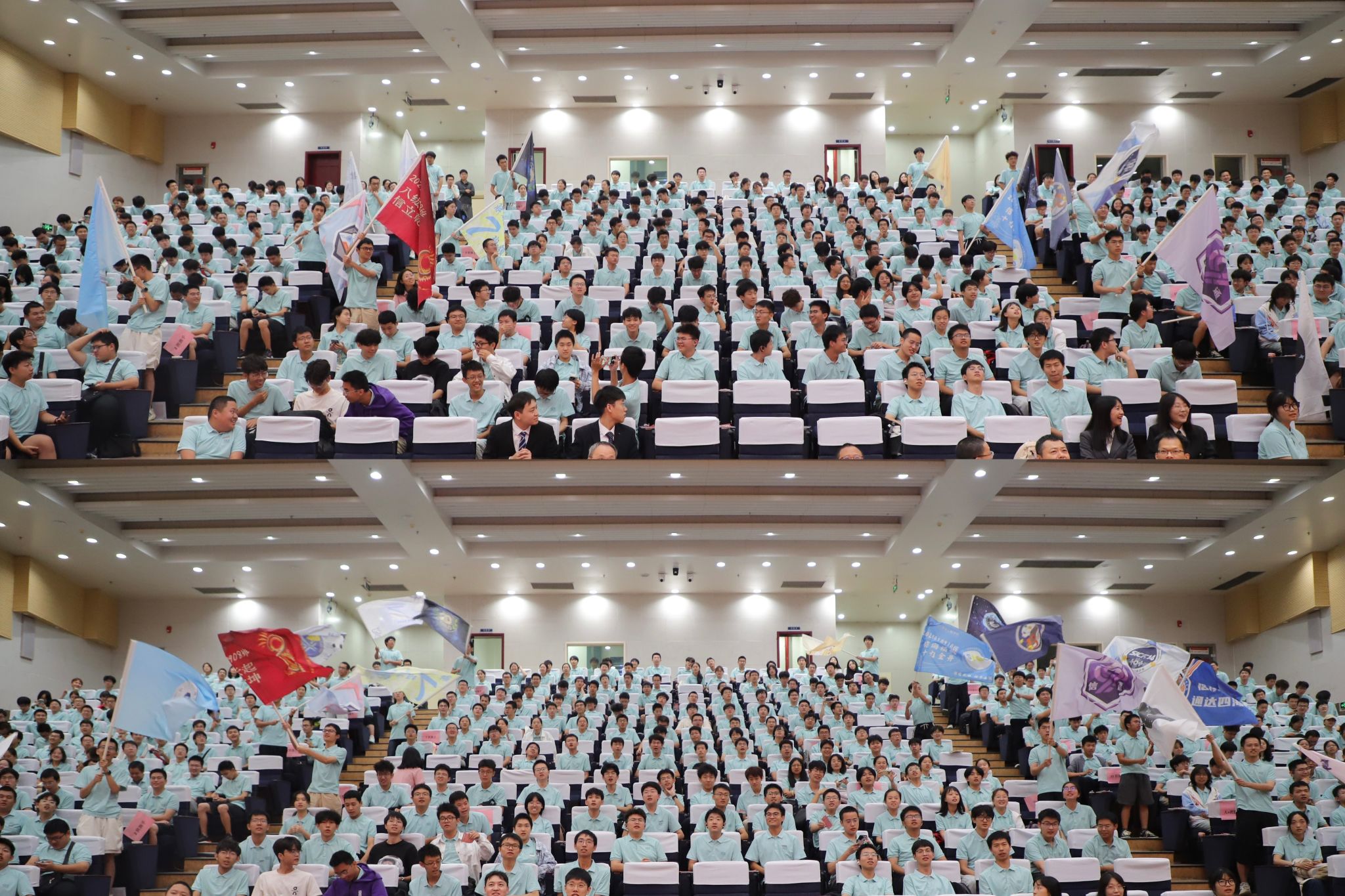 在集体风采展示环节中,各班班旗如浪潮般自下而上依次舞动,接力呼喊班级口号。最后全场师生共同挥旗,高呼“听党指挥、科技报国、信通贰伍、探界无阻”的学科精神与年级口号,展现出昂扬向上的精神风貌与团结一致的集体信念。