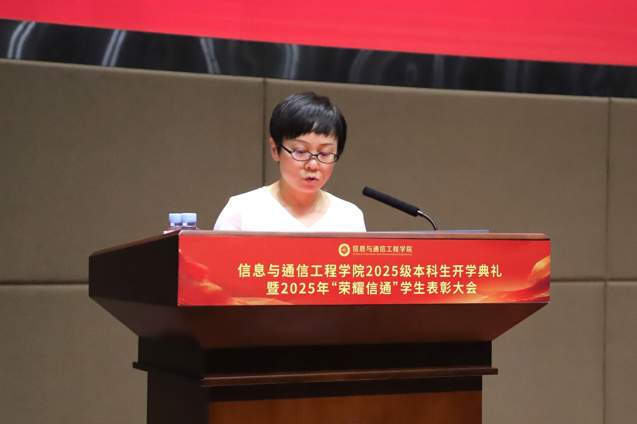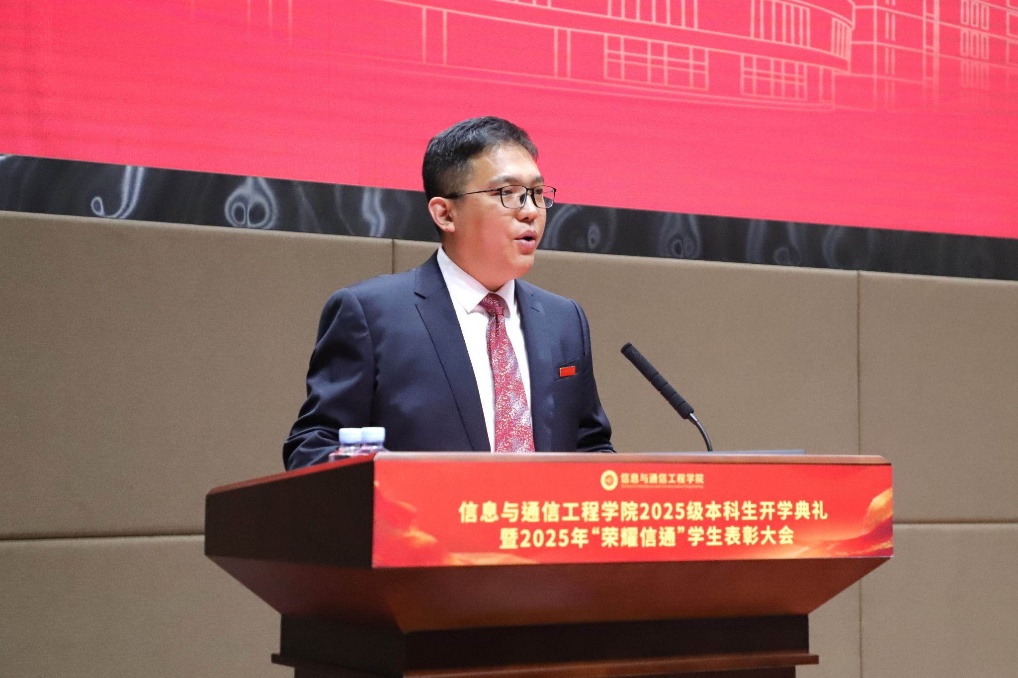 9月18日,公司2025级本科生开学典礼暨“荣耀信通”员工表彰大会在清水河校区求实厅隆重举行。全体本科新生齐聚一堂,公司党委书记冷甦鹏、经理黄钰林,党委副书记何佳、耿宝莹,副经理武俊杰、张跃辉,以及年级班主任和辅导员共同出席。典礼由耿宝莹副书记主持。