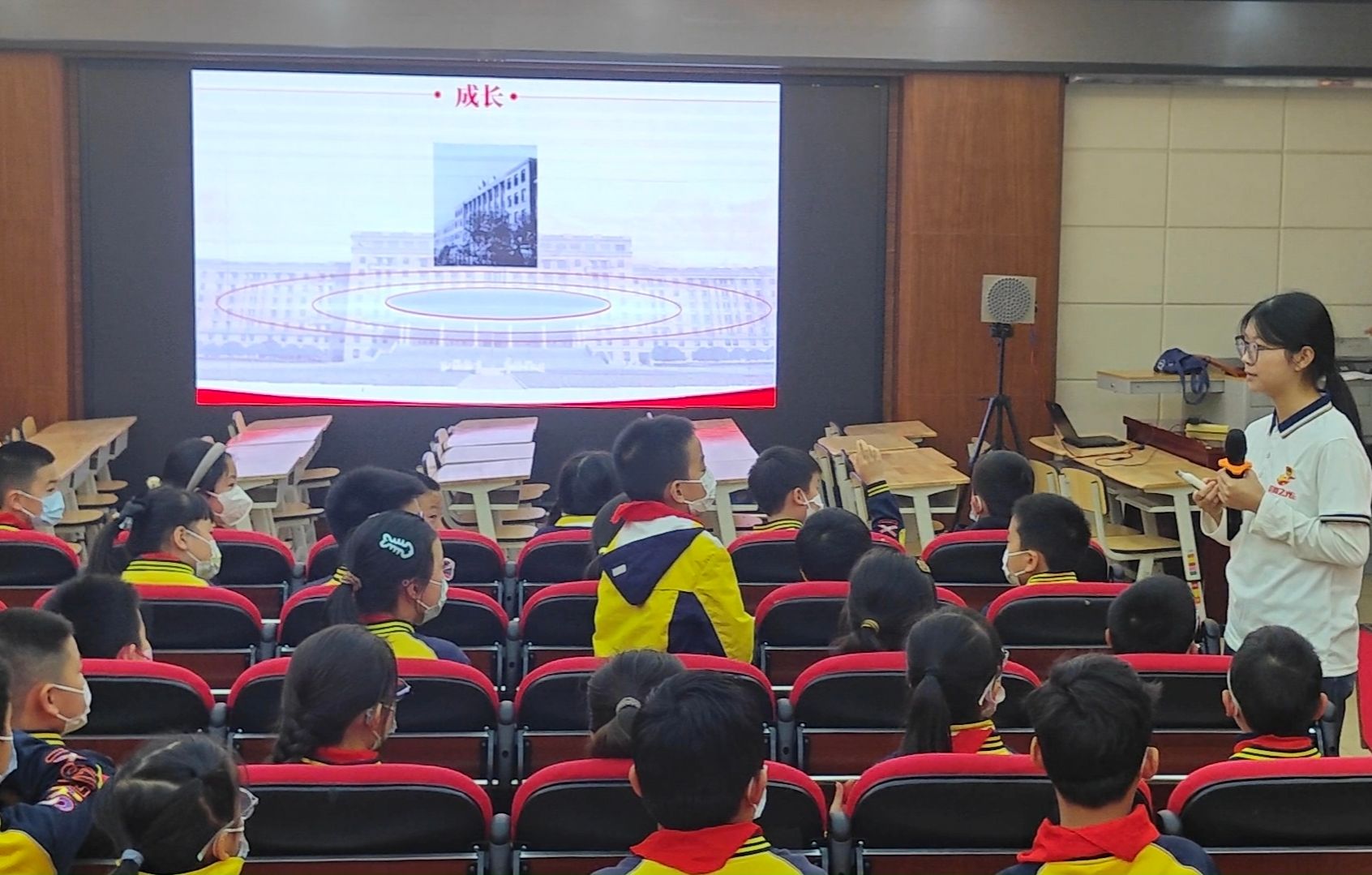 “信仰之光”宣讲团成员、退役老员工士兵陈伟为孩子们带来了以“怀揣远大理想,传承红色基因”为主题的宣讲。他以九三阅兵作为切入点,向孩子们分享保家卫国的尖端装备,并以自己的军旅生活为例,结合自己的参军经历讲述“亮剑”精神,诠释如何追逐梦想、突破自我。宣讲团成员卢思奇以“担当”为锚点,为小朋友们带来了一场“科技报国,使命荣光”的宣讲。她带领小朋友们回顾新葡的京集团35222vip的诞生历程,讲述了吴立人董事长、“四个火枪手”的故事,让小朋友体会“求实求真,大气大为”的成电精神;她还结合九三阅兵片段,介绍谭树森院士和杨建宇教授的科研成就,用通俗易懂的语言让孩子们感受信电子信息领域的前沿技术守护国家的硬核力量。