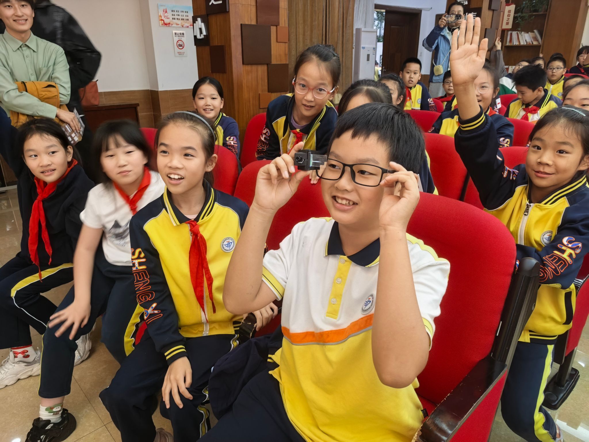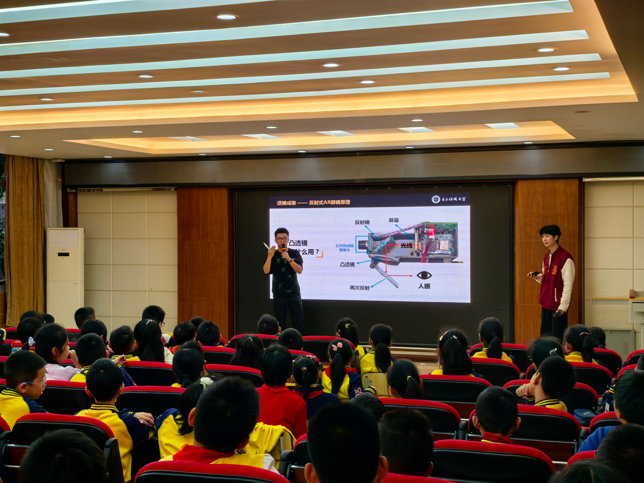 信通科协成员毛青山用简单易懂的语言向孩子们展示热成像AR眼镜的构造与原理。“这副眼镜不同于普通眼镜,它搭载了红外热成像组件,能将物体的温度转化为色彩图像,让我们能“看见”温度。随后,他向孩子们展示如何通过手机连接蓝牙功能,实现实时交互,并鼓励小朋友们要大胆想象,勇敢地去探索科技领域。彭成谨同学以“超声波的秘密”为切入点,生动讲解了超声波的原理及其在生活中的广泛应用,逐步引导小员工们思考-发问-再思考,他还鼓励小员工们就此开展课下思考,不断积聚对科技的兴趣。