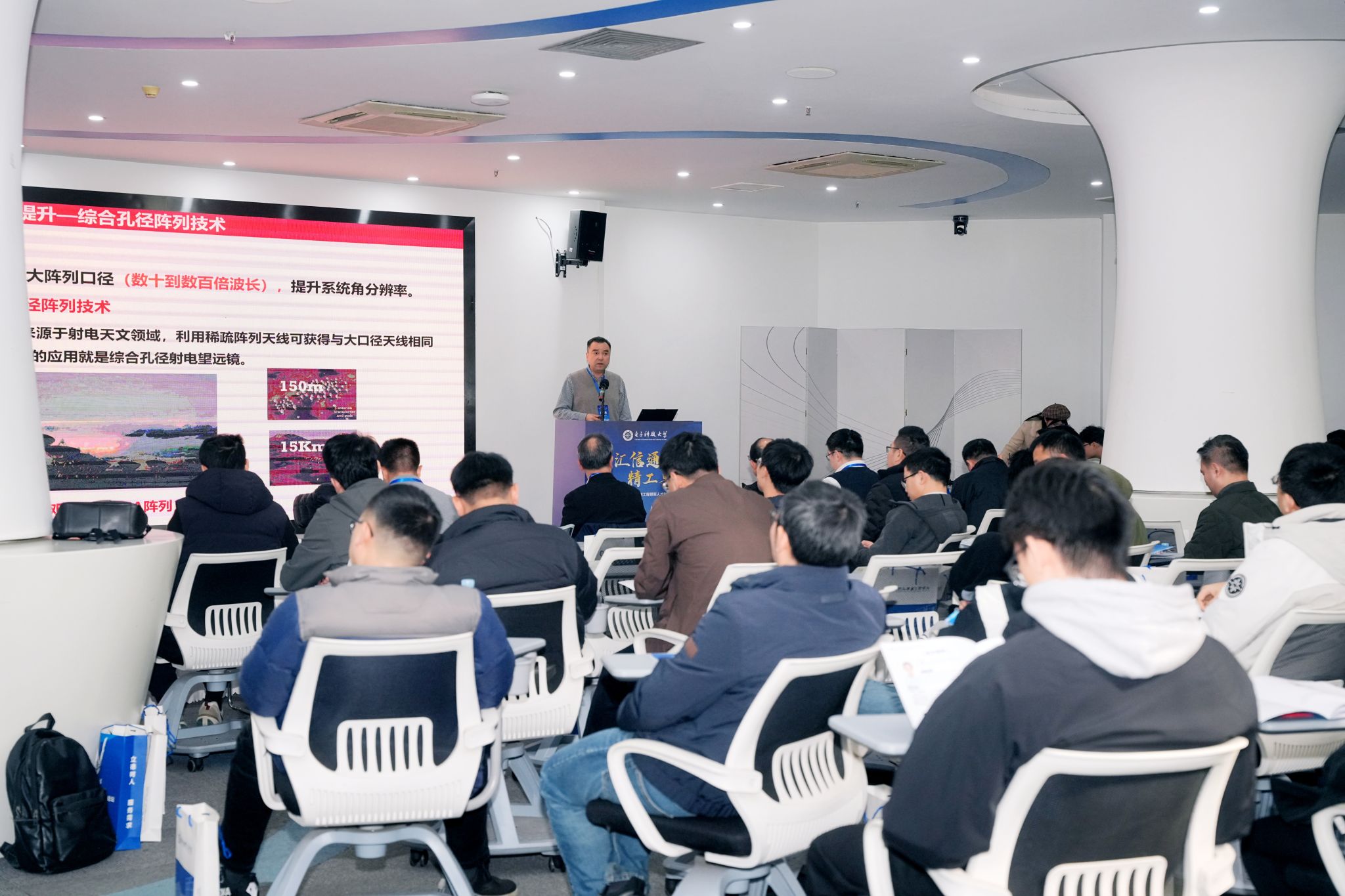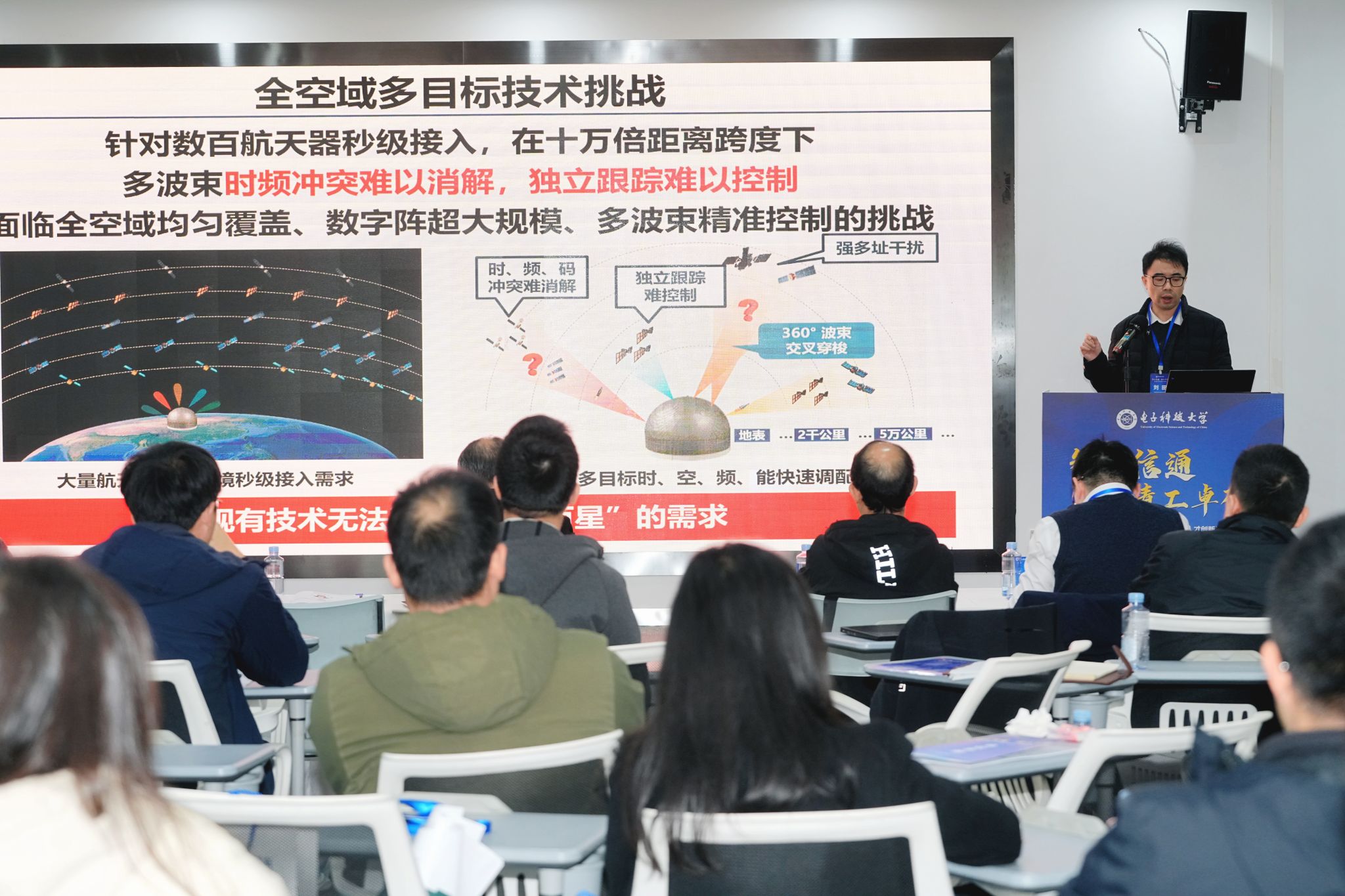 在随后的技术报告环节,三位特邀报告人中国电科集团29所首席专家、副总工程师顾杰研究员,中电网络空间研究院常务副经理杨奎研究员,中国电科集团10所副总工程师刘田研究员围绕阵列处理、生成式智能体、大空域多波束数字阵等前沿方向,分享了最新研究成果与实践经验。