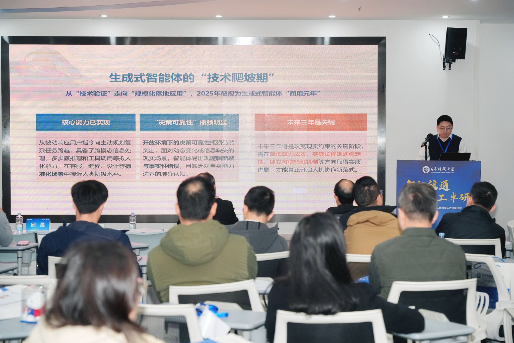 多位工程博士也做了精彩分享,涵盖了保密通信、目标探测、光纤传感、大模型、智慧物流等领域,兼具学术深度与实践价值,展现了工程博士们的创新活力,三位资深指导专家立足学科前沿与产业发展全局,从技术创新性、实践可行性、行业应用价值及未来拓展空间等维度,进行了精准独到的点评与高屋建瓴的指导。