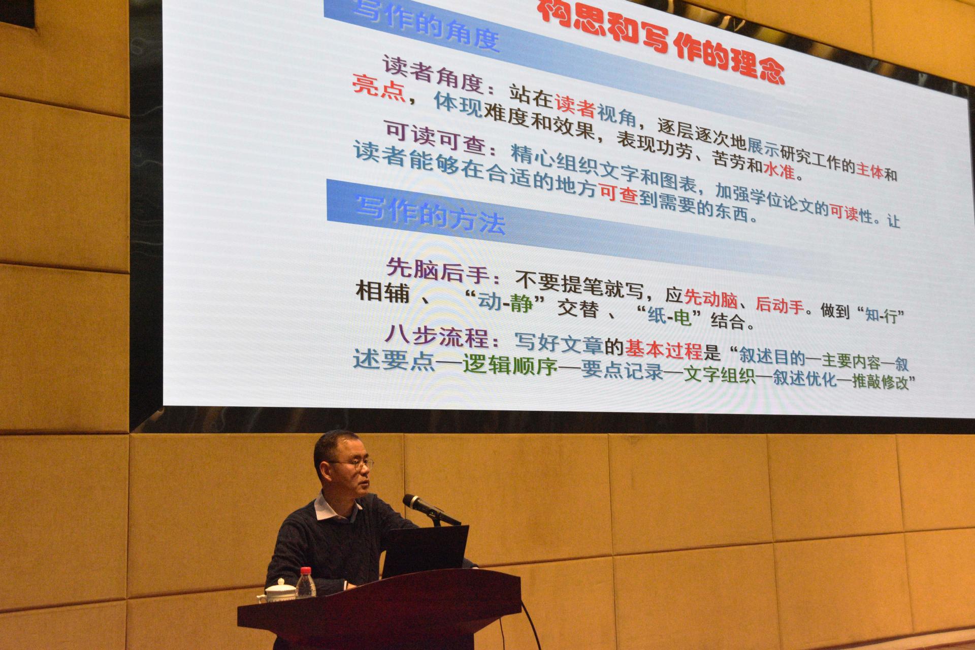 “学位论文要认真地讲好,学会扬长避短是非常重要的本领”。杨建宇教授说到:论文作者在撰写论文时,应该站在读者的角度,逐层逐次地展示研究工作的主体和亮点,同时要使论文具备“可读可查”性,要精心组织文字和图表,加强学位论文的可读性。论文写作前,要先动脑再下手,不要提笔就写,做到“知行”相辅 、“动静”交替 、“纸电”结合。“写论文要学会换角度思考问题,很多时候论文的创新来源于对生活的感悟和体验;当今计算机盛行,但是用纸记录跳动的灵感依然是不可或缺的写作方式。”杨建宇教授在精彩讲述的同时也积极的将自身的感悟传递给大家。