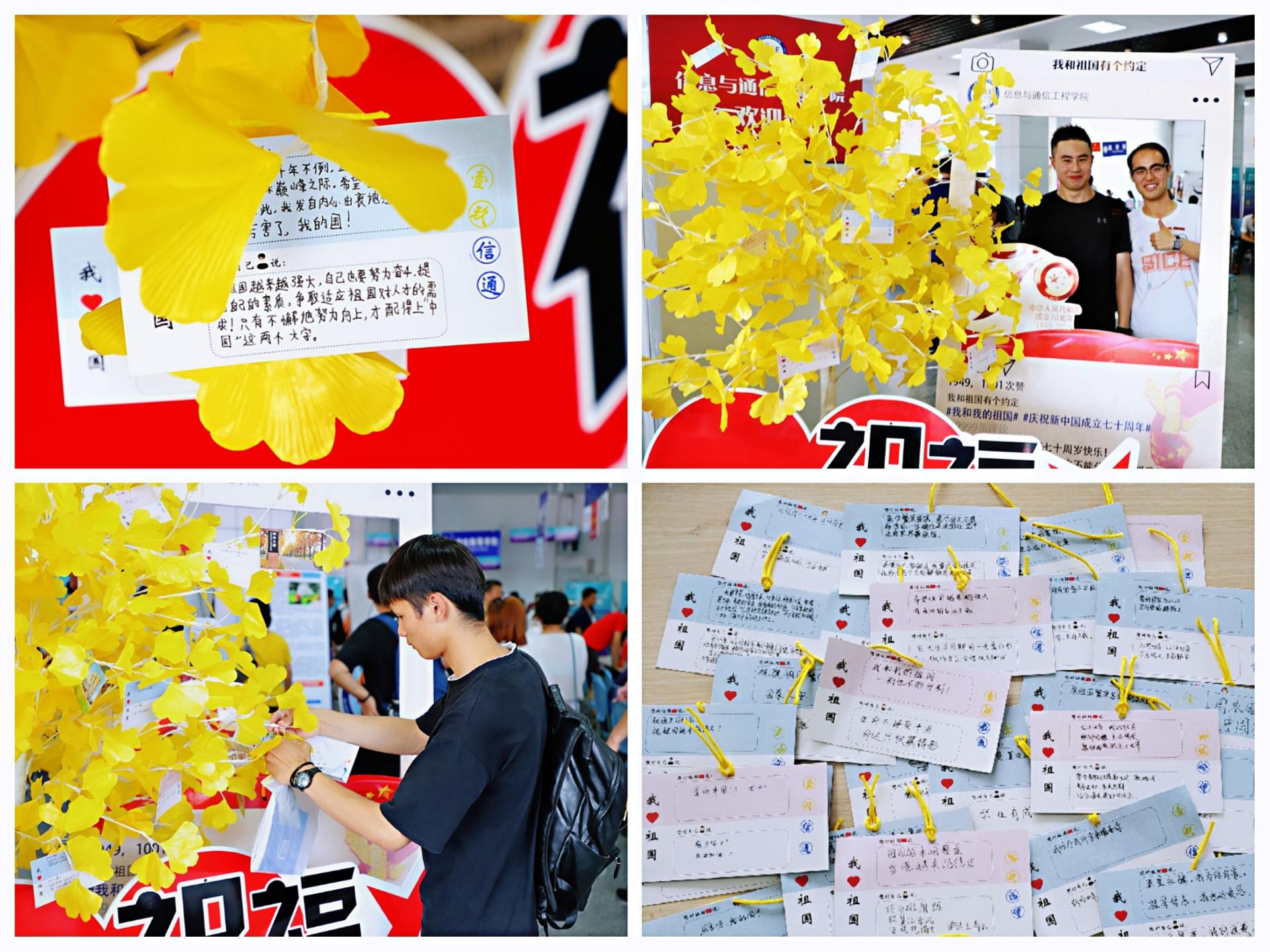 迎新期间,公司开展“集赞祝福祖国,奋斗装点青春”迎新生主题教育活动,在新生报到时发放梦想卡片,写寄语祝福伟大祖国、畅想奋斗青春,在校园内集齐“信通壹玖”印章,装点成电银杏树,旨在鼓励新生做新时代奋斗青年。19级新生写到:祖国越来越强大,自己也要努力奋斗,提高自己的素质,争取适应祖国对人才的需求!只有不懈地努力向上,才配得上“中国”这两个大字!