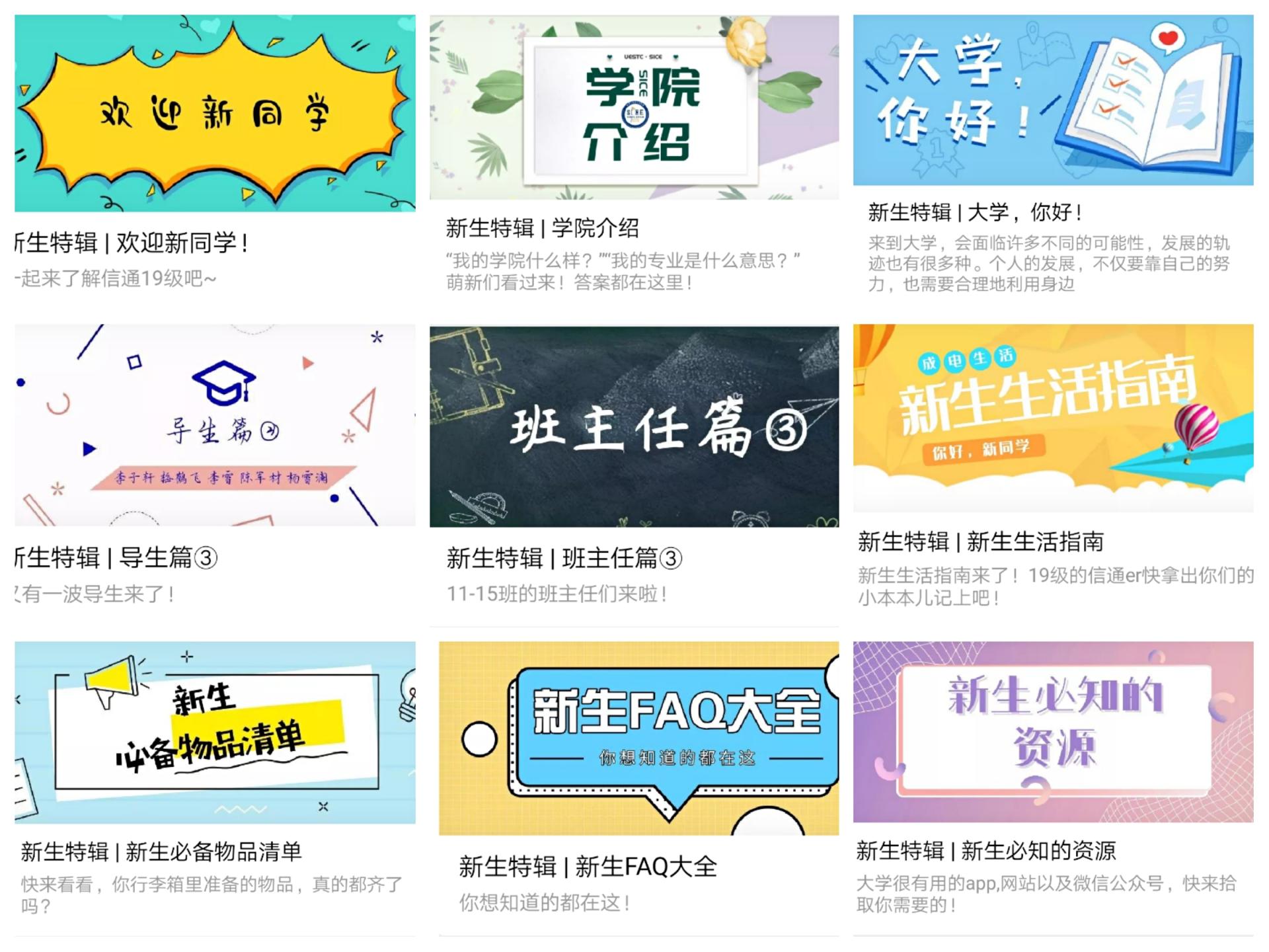 新生名单公布后,辅导员、导生第一时间联系新生,创建年级新生&家长QQ群,辅导员与导生在QQ群里与新生和家长沟通交流、及时解答家长疑问。公司官方微信“信通E家”打造全新栏目——“迎新特辑”,暑假期间发布二十条推送,内容涵盖班主任&辅导员&导生介绍、新生学习资源推荐、老员工活面面观等多个方面,带领新生领略大学初印象。