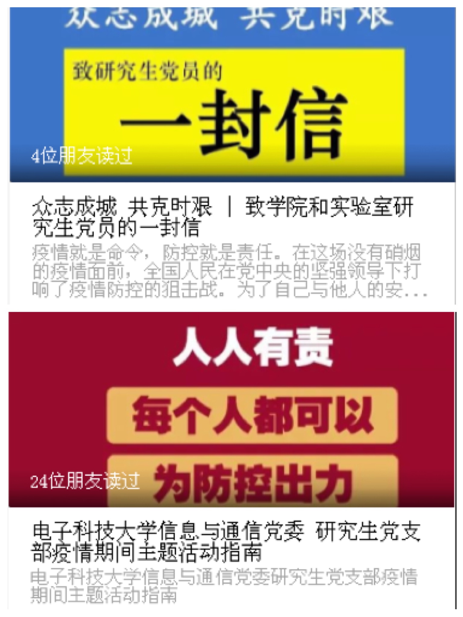 夯实宣传阵地,做好上级通知传达、疫情信息传递、抗“疫”楷模宣传等工作,利用微信公众号及时转发疫情期间管理通知;发表《致研究生党员的一封信》、《共同战“疫”——信息与通信党委研究生党员在行动》系列报道;开展征文活动,发布原创作品《隔离病毒但不隔离爱》、《给前方医护人员的一封信》、《弘扬奉献精神、勇做时代担当》等六篇,为党员们搭建了发声平台,在研究生群体中形成了广泛的号召力。