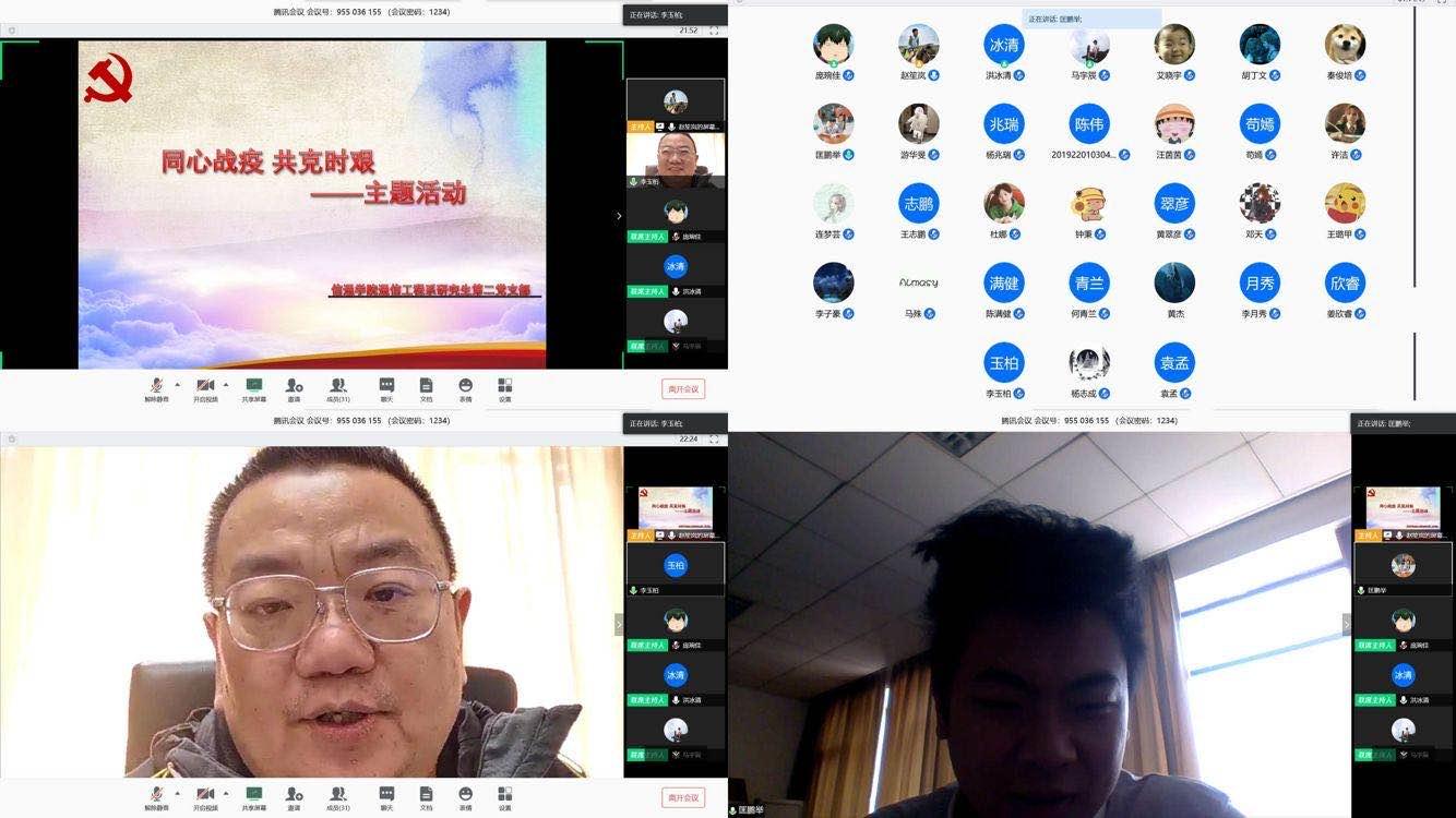 经理孔令讲参加电子工程系研究生第二、四党支部主题党日活动,分享疫情期间的所做所感,探讨中国社会主义制度与国家管理体系的优越性,鼓励大家应科学理性看待舆论,以高度的自律做到停课不停学,继续加强学习与身体锻炼,积极配合地方防疫工作,在疫情过后健康安全返校。