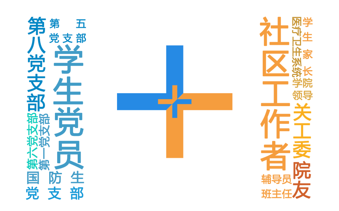 第四党支部杜银徕用假期新学到的知识——Python画图创作,致敬伟大的医务工作者们,为武汉加油,为中国加油;陈皓婷通过乐高积木拼装图案表达自己内心的期盼与祝福;邵楠、杨裕强等通过烘焙、食物摆盘等方式为祖国祈福,同时勉励大家健康饮食,适当锻炼。