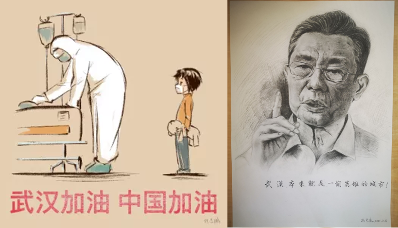 第三党支部陈钦的画中有三双翅膀,寓意疫情爆发后,前线的医务人员组成了守护武汉的第一双翅膀;坚守岗位,组成隔断传播途径战线的工作战士,是第二双守护我们的翅膀;十四万万同胞心系武汉,张开最坚实的翅膀守护这座可爱的城市和那些可爱的人。第三党支部李睿聪通过海报设计,展现国家的大爱与誓言,相信人间的大爱温暖,相信誓言的铿锵有力,用真情实感和实际行动,为战士们加油,为中国加油!