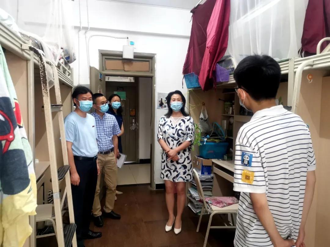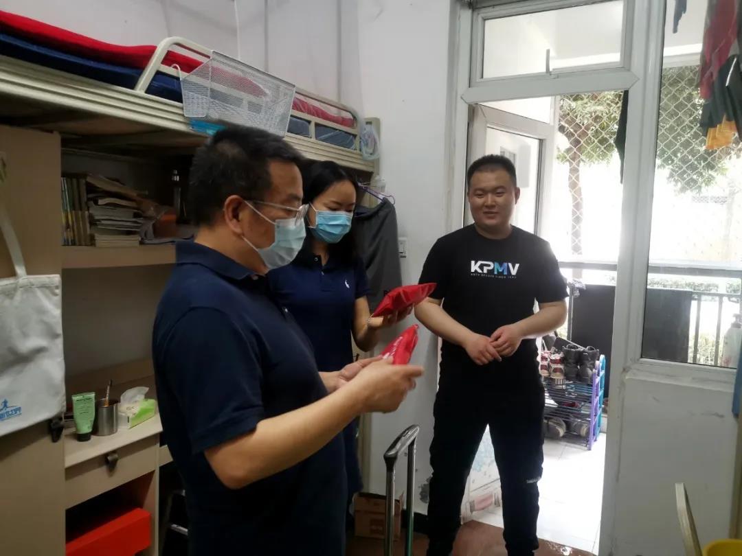 在同学们进入寝室后,公司领导也来到宿舍区,细心问候了同学们的返校情况,为大家送上了返校小礼物与爱心防疫包。