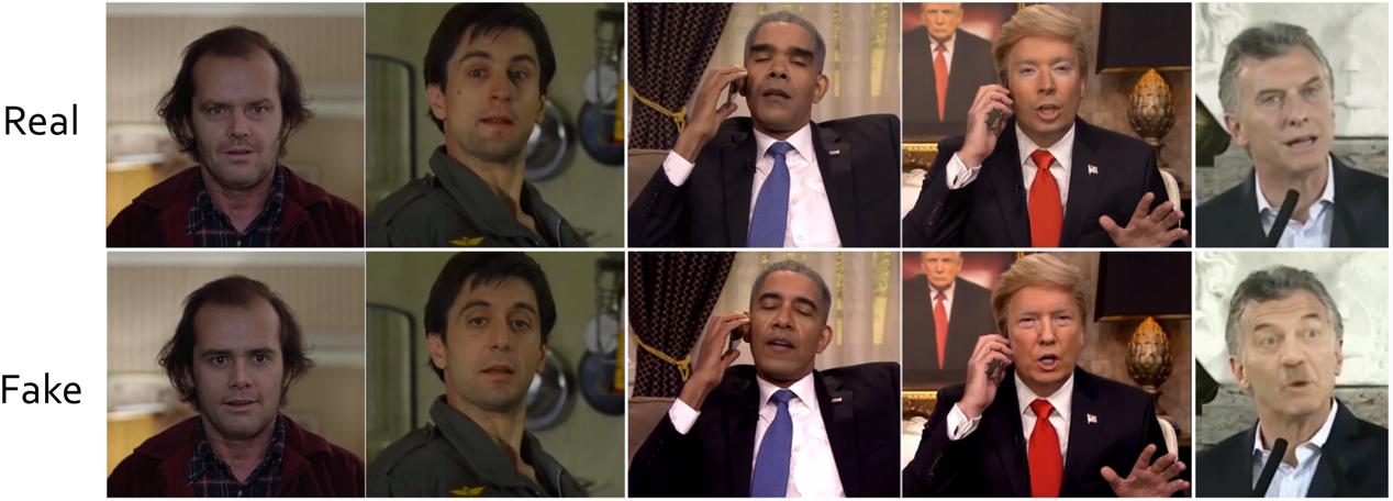 图2:Face Forgery和Deepfake技术可以伪造出逼真的图像,第一行为原始的真实图像,第二行为机器学习技术生成的伪造图像(来源:YouTube)。