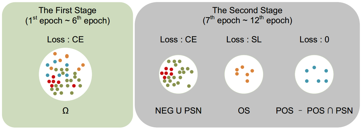 图1:每一个batch内不同样本使用的损失。训练的第二个阶段中,负样本和伪负样本使用交叉熵损失来充分地利用带噪类别标签正确的前-背景信息