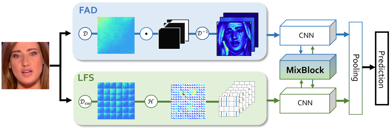 具体地,F3-Net首先提取了FAD (Frequency-Aware Decomposition) 和LFS (Local Frequency Statistics) 两种频域特征,然后设计了MixBlock模块,利用cross-attention机制将二者融合并共同进行优化,最终输出结果。网络结构如图3所示。