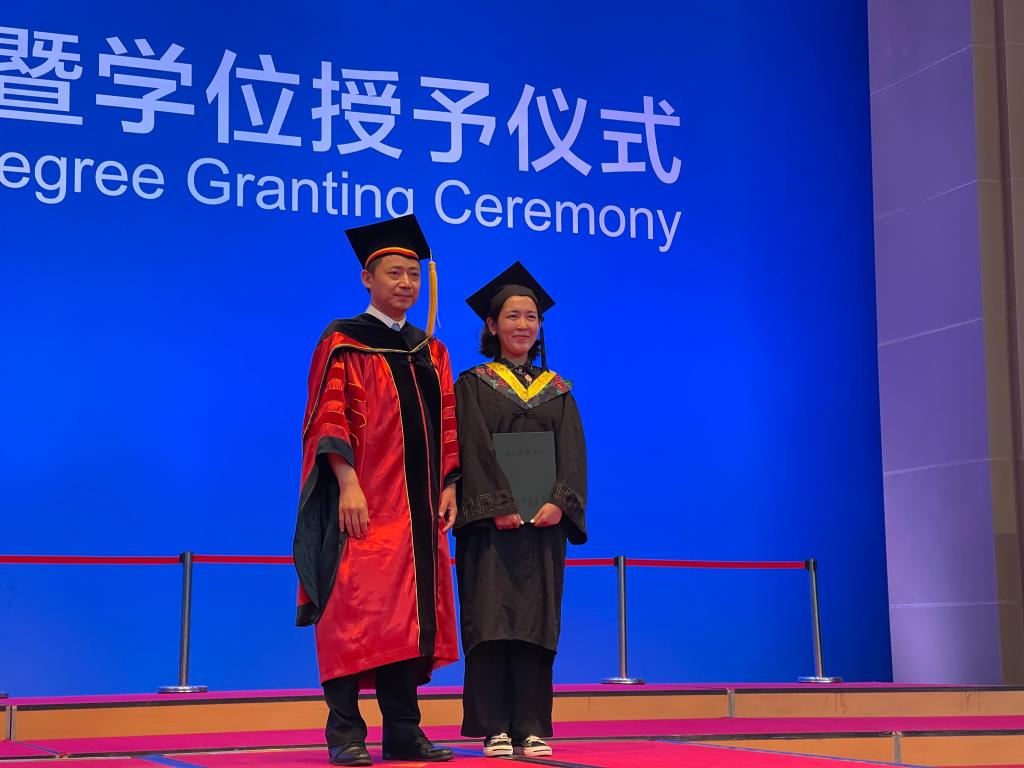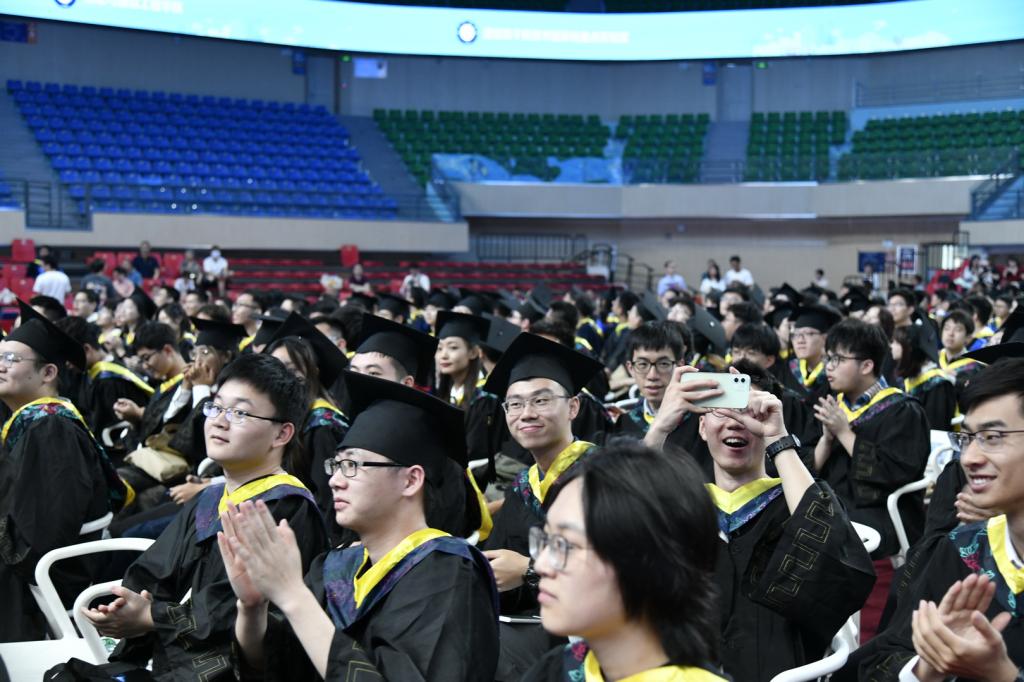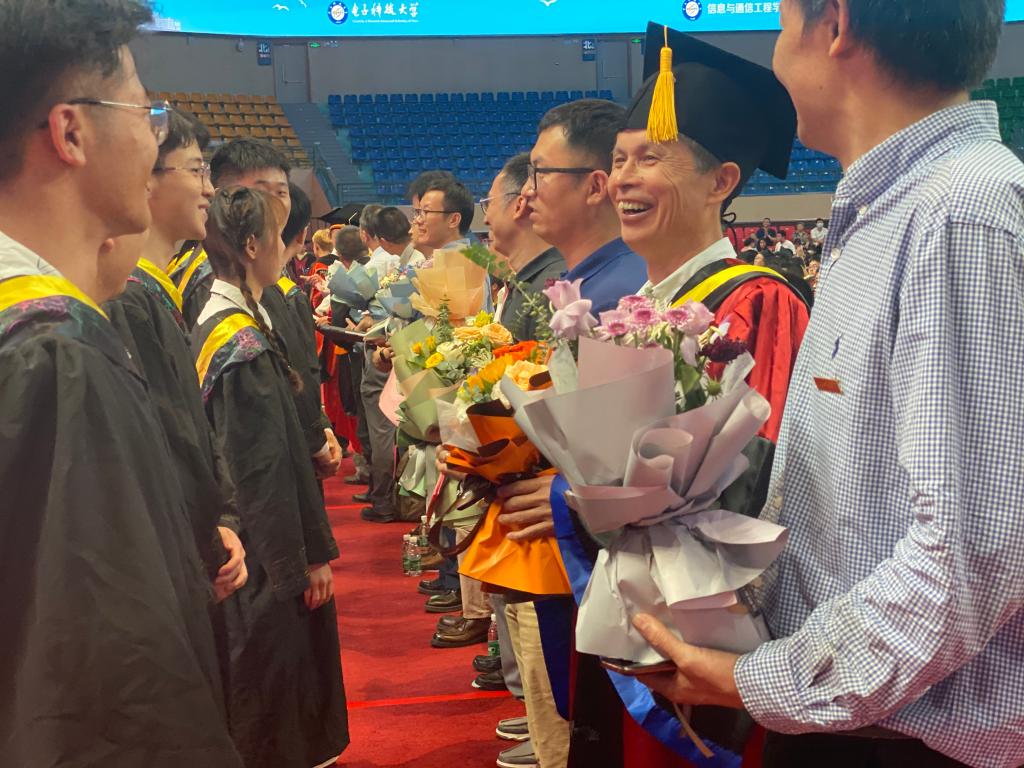 毕业典礼上,同学们以一首《不说再见》表达了对母校的悉心栽培、师长的殷切教诲和对同窗朝夕相伴的不舍与怀念。毕业生们纷纷向老师们献上鲜花,表达感恩与祝福。