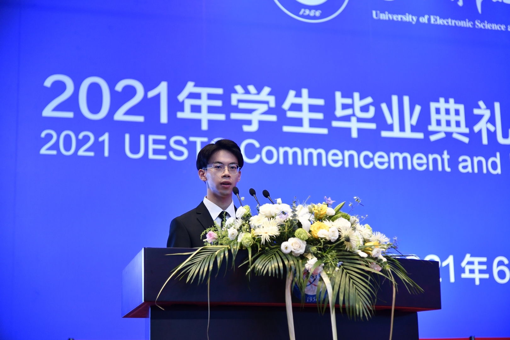 成电杰出员工、物联网工程专业2021届本科毕业生田凯元作为员工代表发言。他说,站在“两个一百年”奋斗目标的历史交汇点上,作为新一代青年,要始终保持探索的激情和创新创造的冲动;要心怀感恩,不论何时都会自豪地说我们是成电人;要主动去了解和满足大众需求,用科技的力量去引领所在行业革新发展。他表示,2021届毕业生一定会接好新时代的接力棒,与新时代同向同行,在盛世中肩负重任,到祖国最需要的地方贡献成电力量!