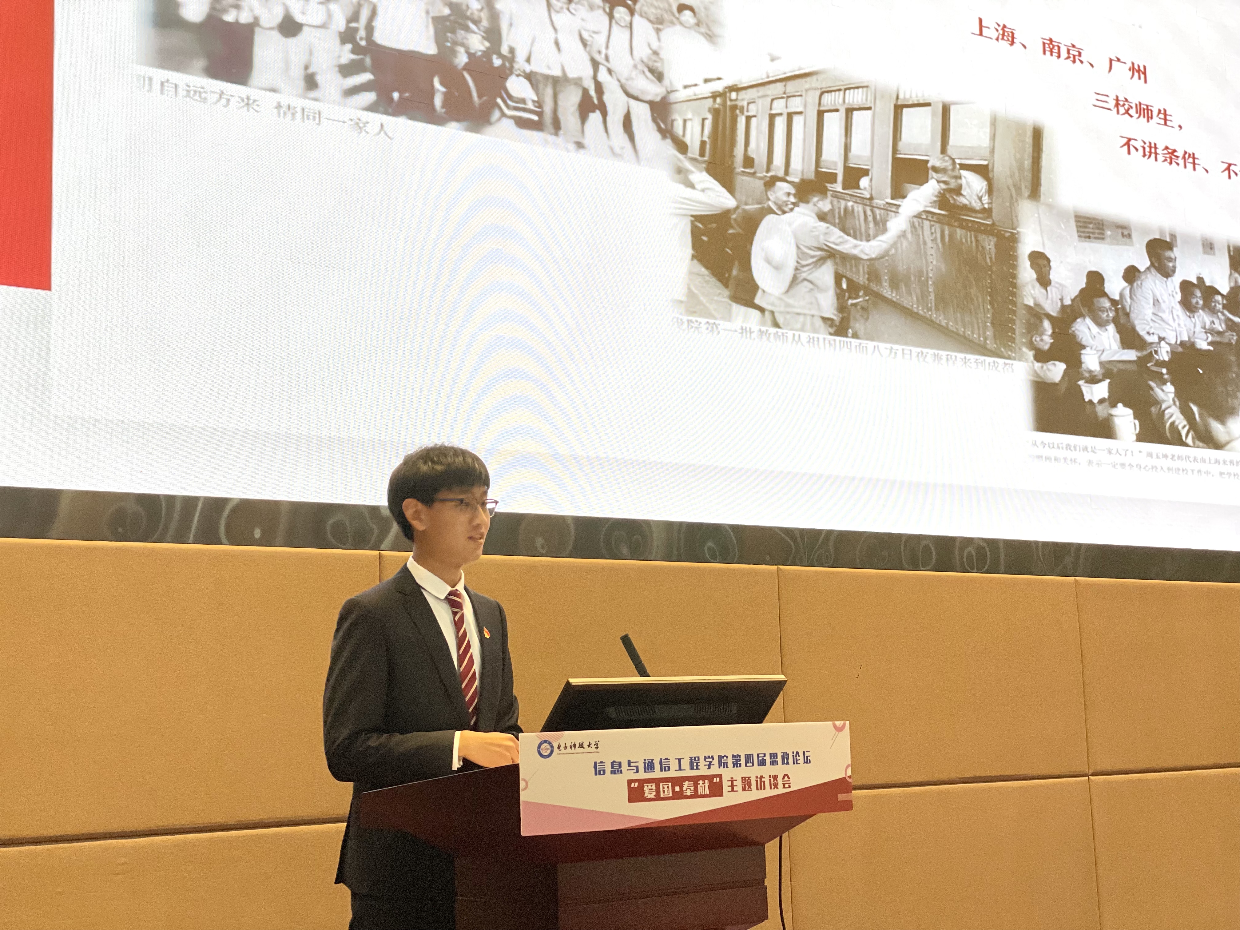 赵苇航作为员工代表,以“爱国志愿行 奉献新时代”为题分享自己关于“爱国 奉献”的理解与践行。他从老一辈成电人献身国防事业、为祖国培养电子信息人才的坚定信仰讲起,同时结合自身专业学习和志愿服务经历,表示要影响和带领更多的人践行志愿精神,发扬奉献情怀,承担社会责任,投身科研攻关,展现成电学子大气大为的担当。