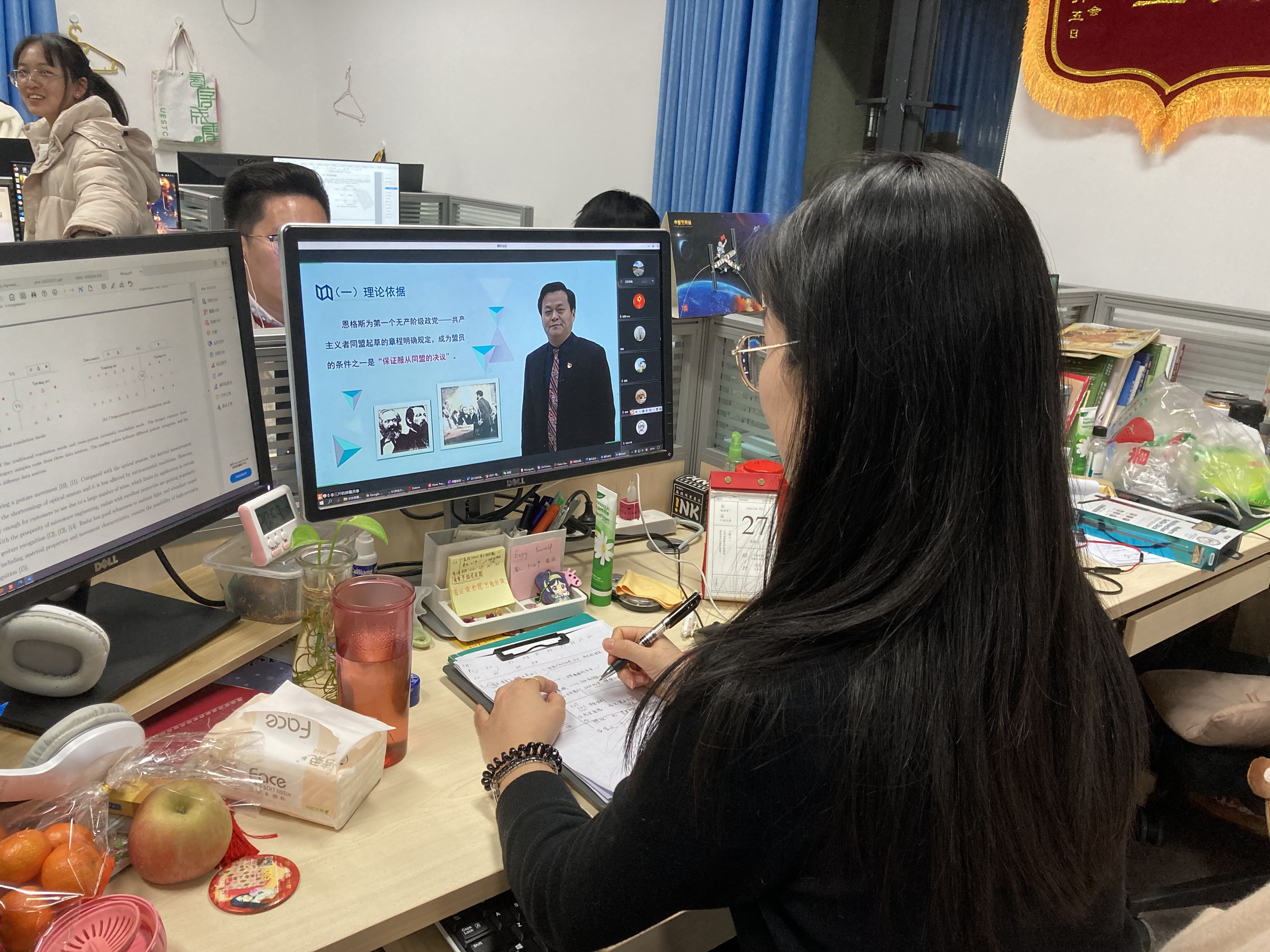为进一步坚持“一条主线不动摇”,始终坚持以党建引领,强化政治建设,新葡的京集团35222vip(通信抗干扰技术国家级重点实验室)党委组织各研究生党支部观看2022 年春季“开学第一课”,学习“两个确立”的生成依据、伟大意义、现实践行,为迎接党的二十大做好准备。“开学第一课”由四川大学马克思主义公司的李辽宁、罗静和郭绍均,三位优秀教师进行讲解,开篇抛砖引玉以孟晚舟事件为例指出西方国家为打压中国高科技企业不择手段,结合理论再从“两个确立”的生成依据、“两个确立”的伟大意义、“两个确立”的现实践行三个层面着重强调主题。