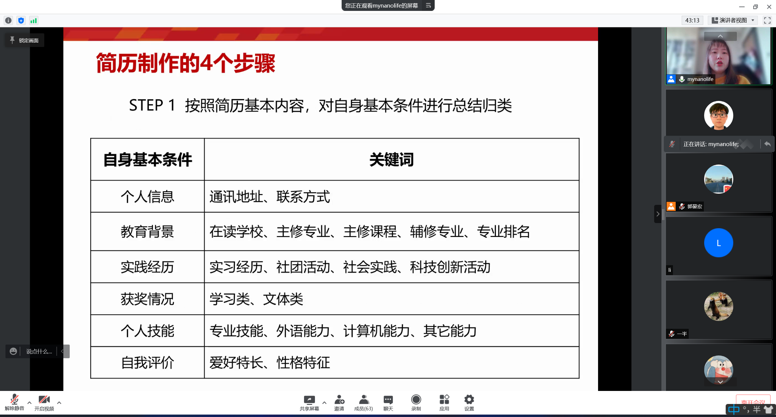 随后刘老师从个人基本信息、求职意向、教育背景和实习实践经历四方面阐述如何做好一份简历。刘老师强调,想要为简历加分,简洁恰当的个人信息、明确的求职意向、丰富的教育背景、具体且高质的实习实践经历是必须的。