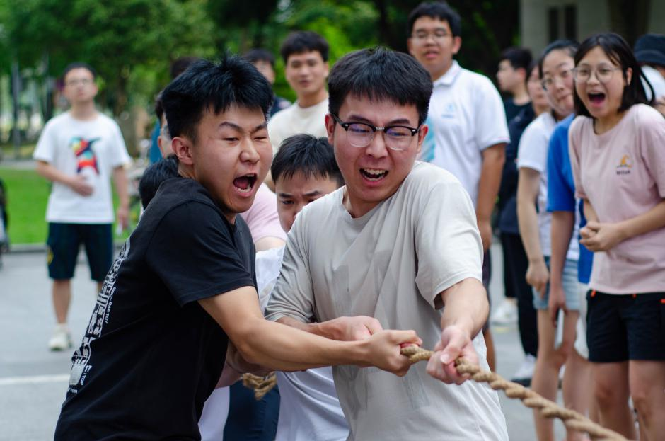 毕业生20个班级报名参加,各班排队轮流进行运动项目,既有竞技的紧张感,也有技巧的趣味性。集体拔河项目中各班的同学热情高涨,使出浑身解数想要在毕业之前再为班级出一份力;无敌风火轮项目需要同学们整齐划一,喊着口号统一前进;光盘拔河项目考验了同学们的灵活性,同时也需要观察力,找到技巧便是制胜法宝。