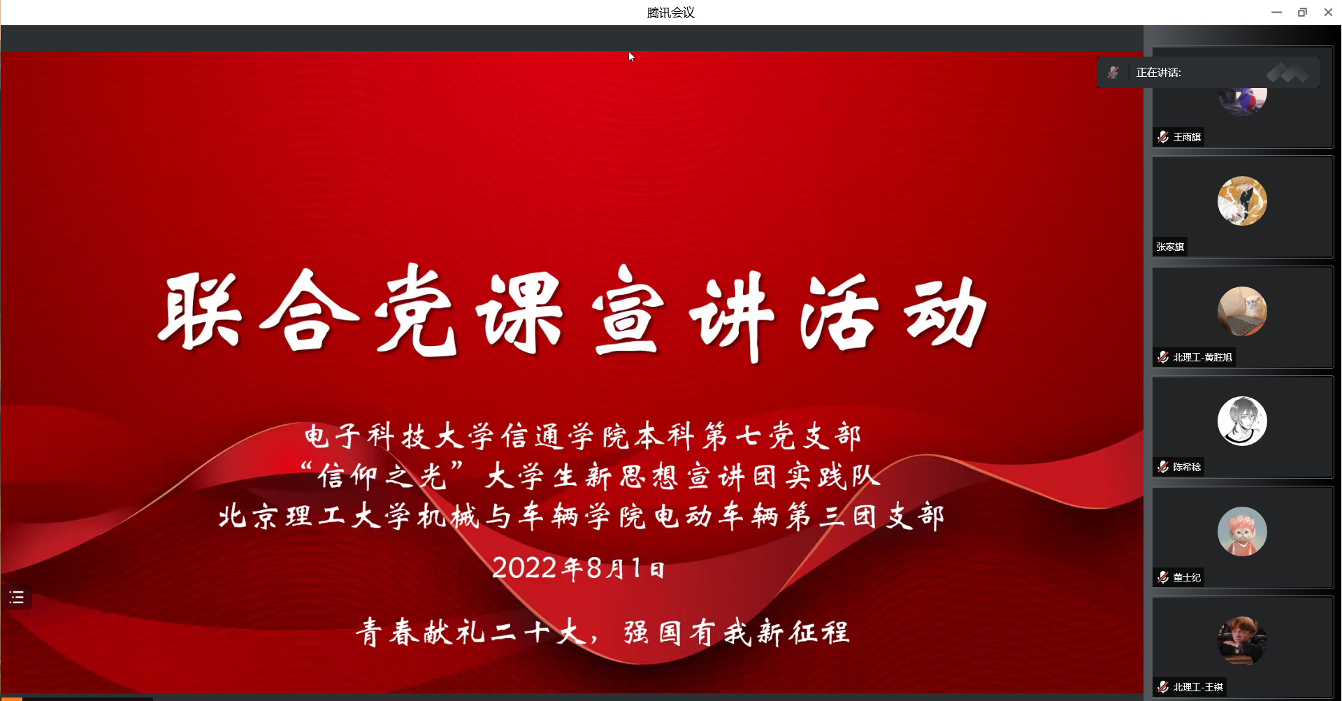 8月1日,实践队与北京理工大学机械与车辆公司电动车辆第三团支部举行“青春献礼二十大,强国有我新征程”线上党团联学共建活动。实践队成员李茂以“传承红色基因,走好科技长征路”为题进行微党课宣讲。