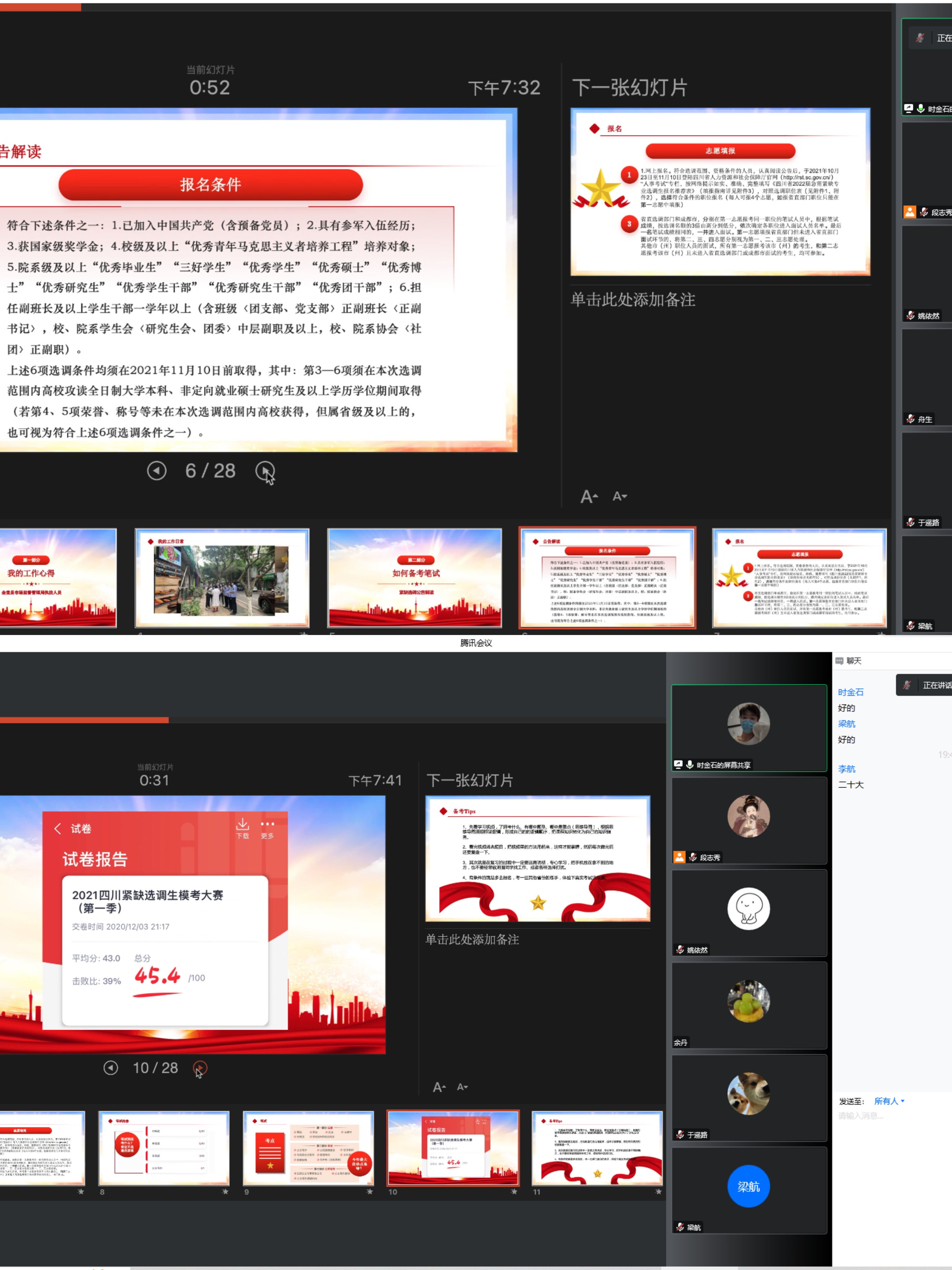 紧接着,由员工梁航从选调的意义与精神等宏观方面出发,分享了选调是各省党委组织部门有计划地从高等院校选调品学兼优的应届大学本科及其以上毕业生到基层工作,作为党政领导干部后备人选和县级以上党政机关高素质的工作人员人选进行重点培养,鼓励学弟学妹要结合自身实际做好职业规划,扎根基层为国奉献。并就公务员考试的整个时间线做了梳理,提醒大家应当提前做好准备。