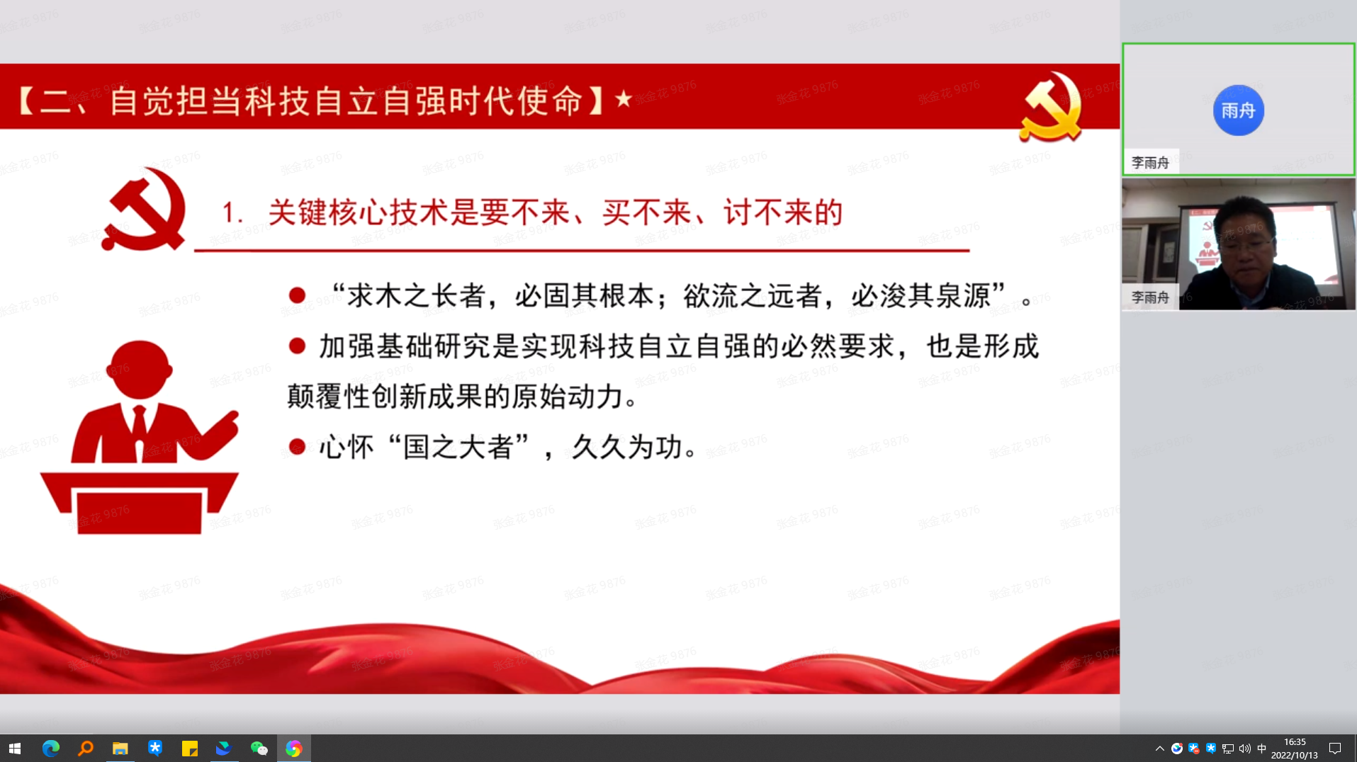 紧接着,陈老师又就“自觉担当科技自立自强的时代使命”这一方面,总结了以下三点:关键核心技术是要不来、买不来、讨不来的,“我国自主创新事业是大有可为的”,以及自觉担当科技自立自强的时代使命该如何做。