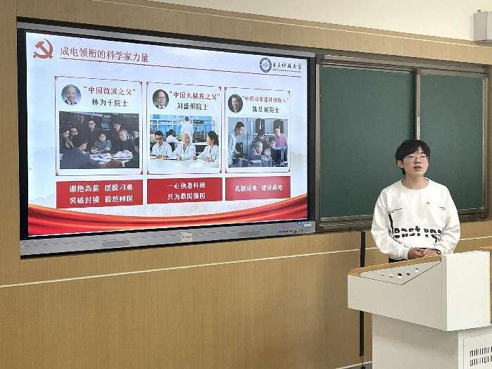 钟翔宇同学从成电优秀学者、教师出发,以“中国太赫兹之父”刘盛纲院士为例,向现场听众介绍了科学家精神。何为科学家精神?习近平总书记指出:“科学家精神是科技工作者在长期科学实践中积累的宝贵精神财富。”具体表现为爱国、创新、求实、奉献、协同、育人的宝贵品质,是中国共产党精神谱系的重要组成部分。这一切都体现在刘盛纲院士从教成电、领衔中国太赫兹发展、把国际权威会议“抢”到成都办等事迹中的点点滴滴。对此,钟翔宇同学也展露了这样的心声:“今日成电青年,未来国之栋梁,作为新时代的老员工,我们成电学子也应怀爱国奉献之心,立科技报国之志!”