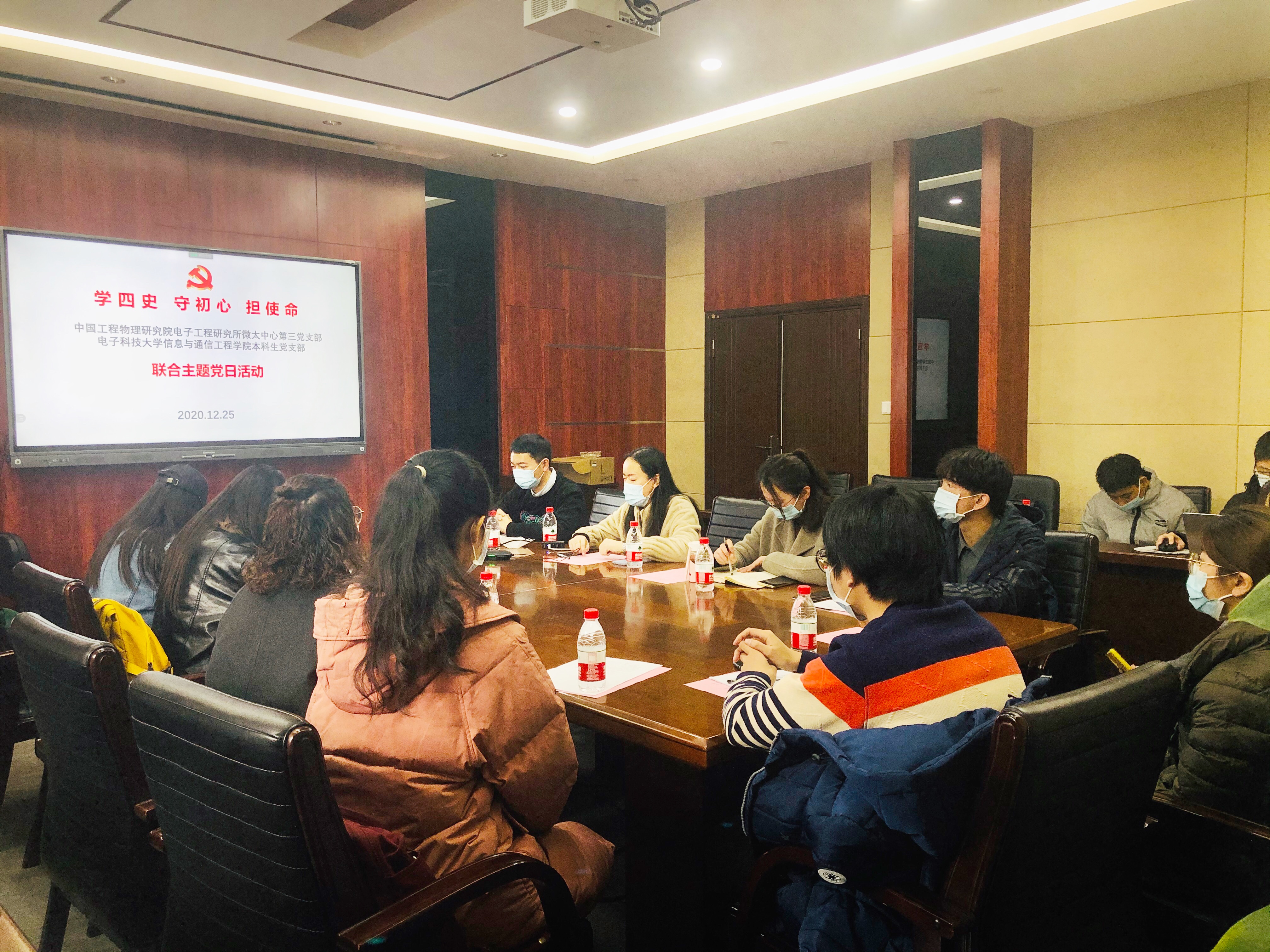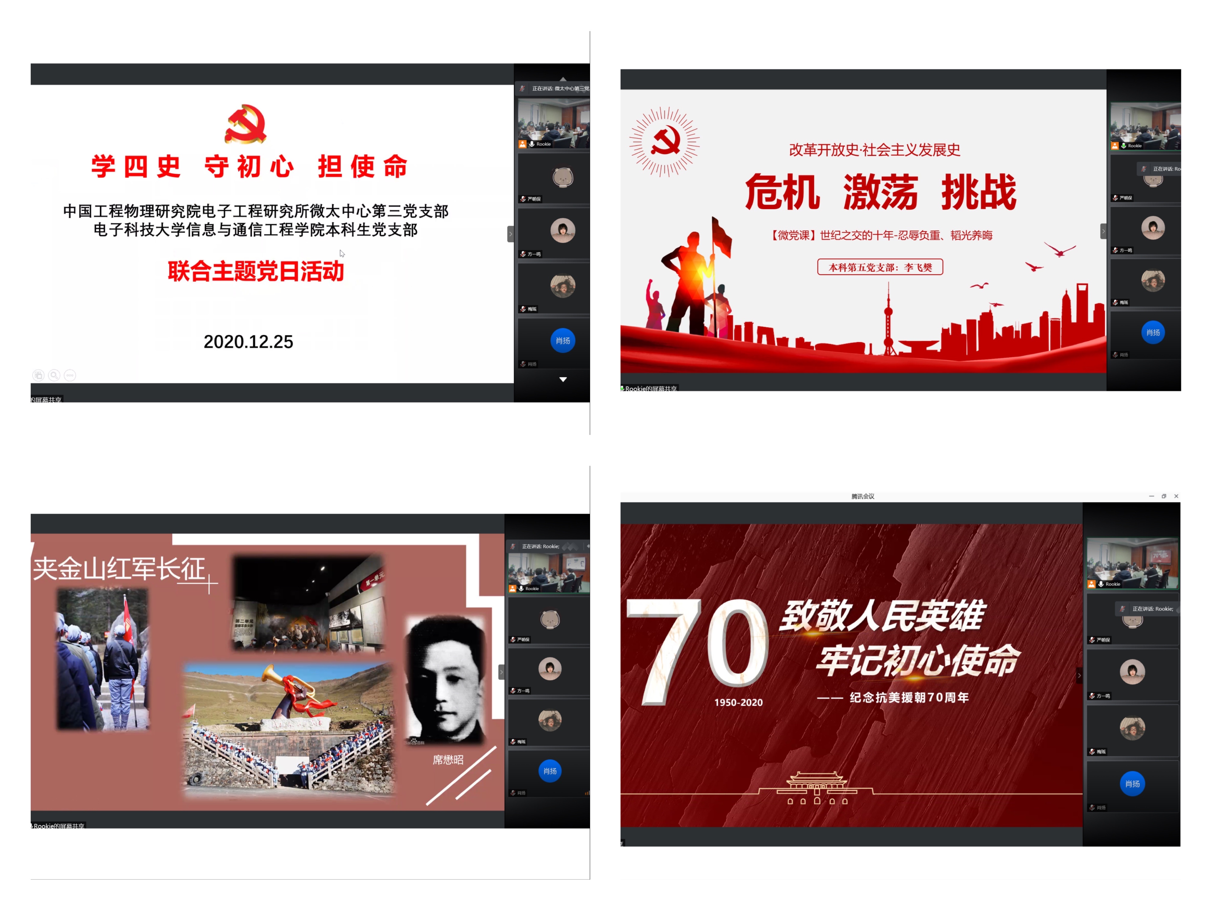 12月25日,新葡的京集团35222vip本科生党支部与中国工程物理研究院微系统与太赫兹研究中心党支部联合开展“学四史 守初心 担使命” 主题党日活动,活动以线上线下结合的方式进行,双方党支部党员代表线上参加。