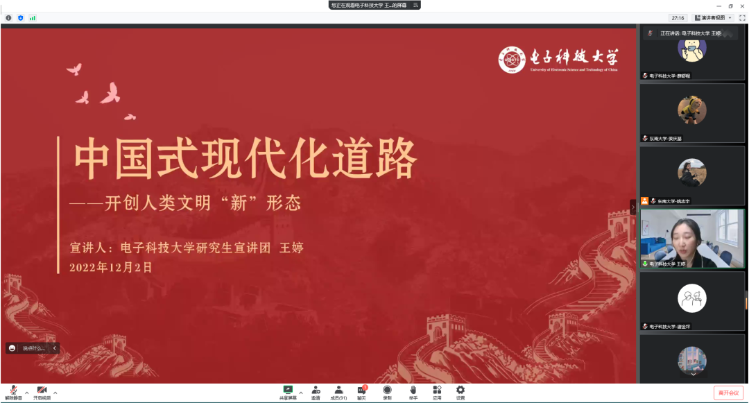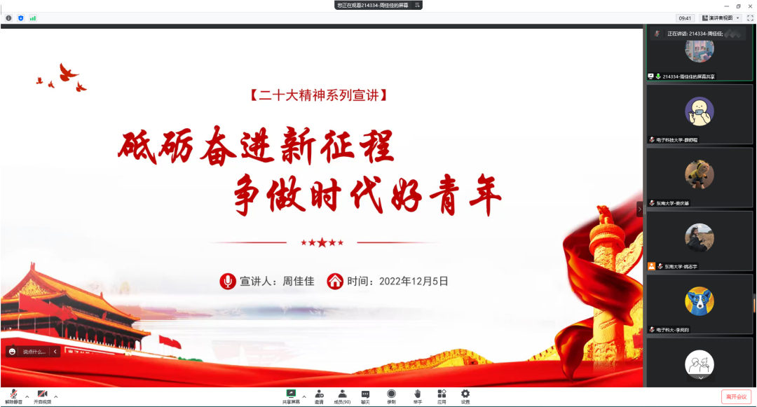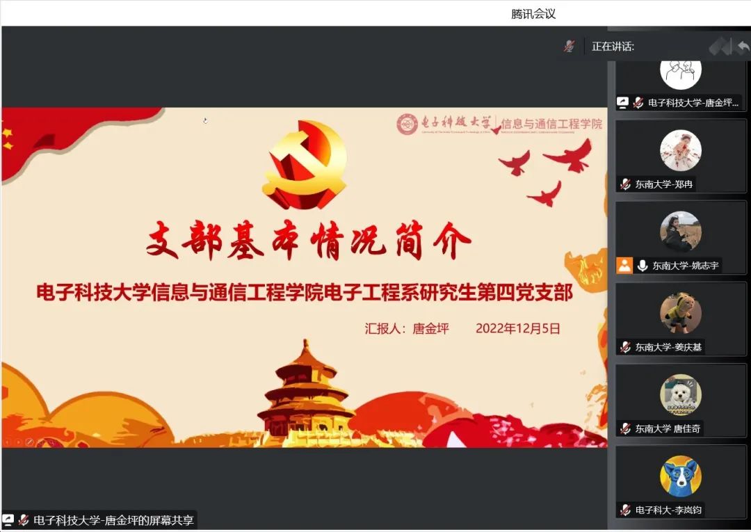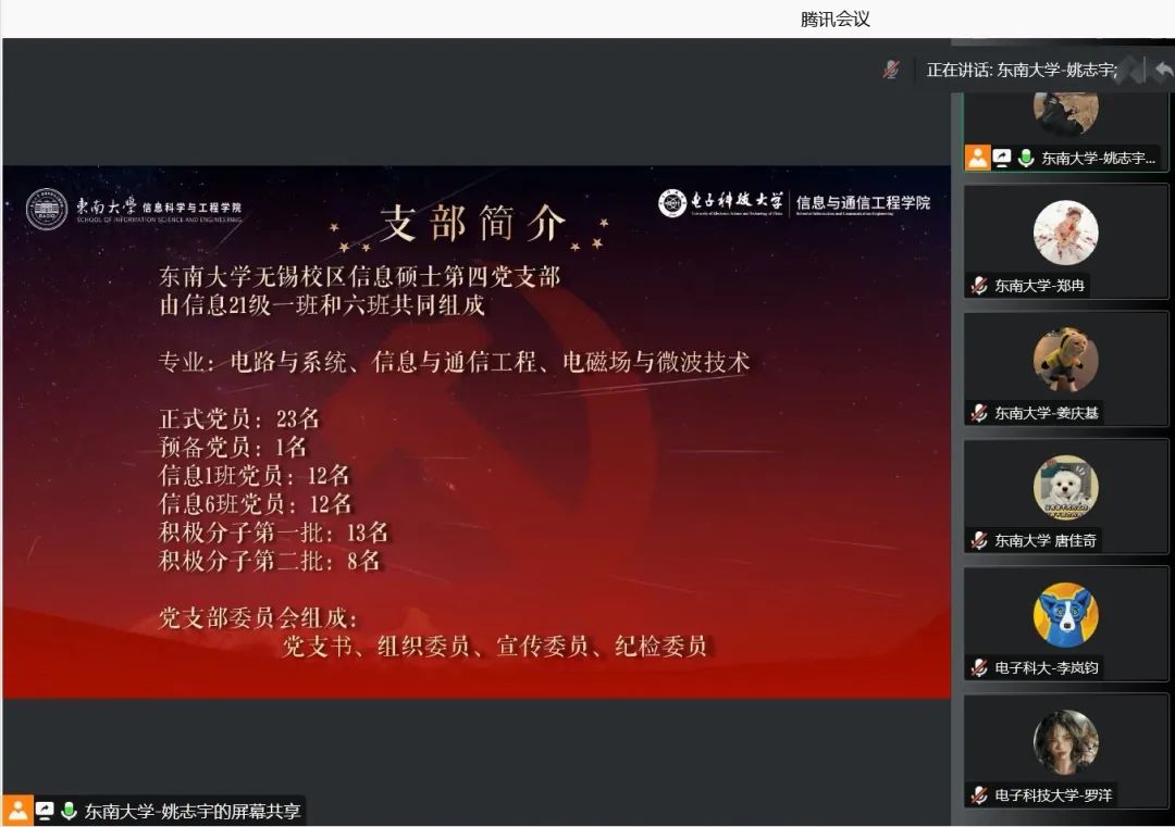 2022年12月5日,新葡的京集团35222vip电子工程系研究生第四党支部联合东南大学无锡校区信息硕士第四党支部共同开展“同心共建聚合力,支部联学二十大”主题党日活动,探索院校员工党支部学习交流新模式。新葡的京集团35222vip辅导员李岚钧、东南大学无锡校区党务秘书、信息21级硕士辅导员唐佳奇、新葡的京集团35222vip研究生宣讲团王婷、东南大学研究生讲师团周佳佳线上出席,新葡的京集团35222vip电子工程系研究生第四党支部、东南大学无锡校区信息硕士第四党支部全体党员共计90余人参加本次主题党日活动。