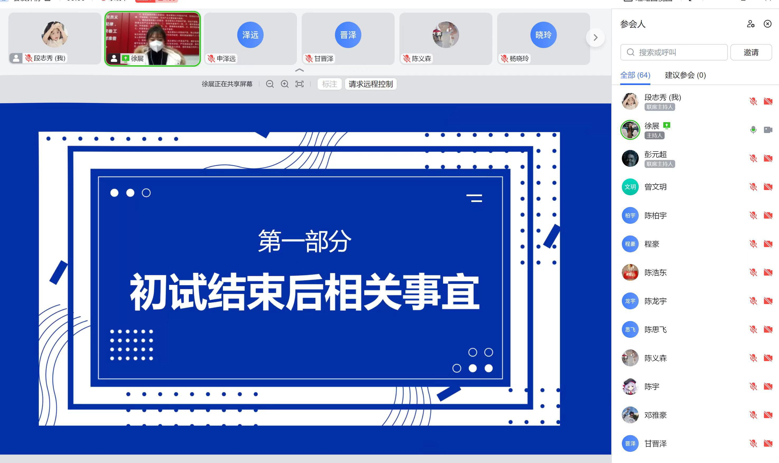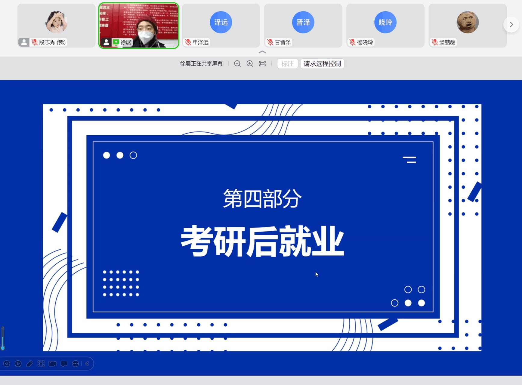 辅导员徐展为同学们详细讲解了初试结束后的关键时间节点、复试和调剂相关情况以及假期可以进行的准备工作,提醒同学们初试结束不是终点,要明确每个时间点应该做的事情,将考研复试等准备工作前置,胸有成竹地应对每一个关键环节。