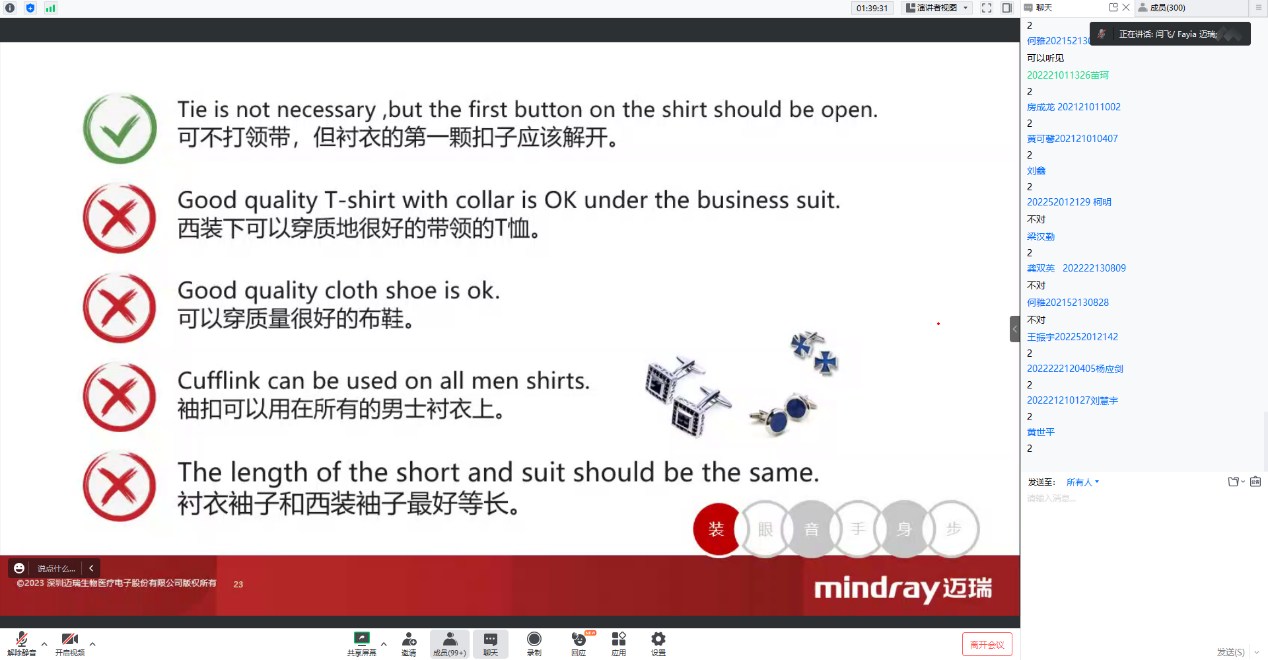 为了打造自己的第一印象,闫老师点明了五感开关的三个密码:视觉语言,声音语言,文字语言,更为具体而言,即:装、眼、音、手、身、步六方面。此外,闫老师纠正了关于商务正装和商务休闲的误区,并提出了TPO(TIME, PLACE, OBJECT)原则。