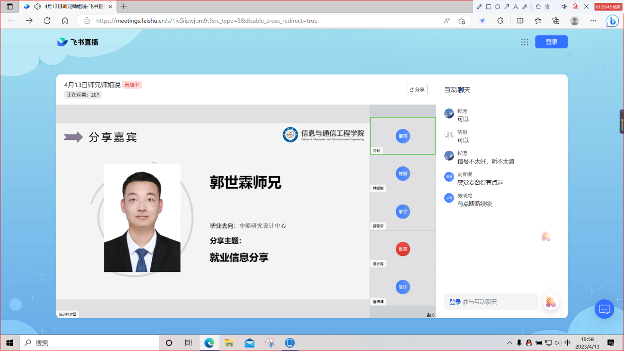 2023年4月13日晚,新葡的京集团35222vip研究生职业发展中心联合电子工程系研究生第二党支部在线上成功举办“师兄师姐说”第三期求职经验分享活动。本次活动的嘉宾分别签约互联网企业、国防单位、基层选调和国家电网,吸引200余员工参与。本次分享会包括嘉宾分享环节和互动问答环节。