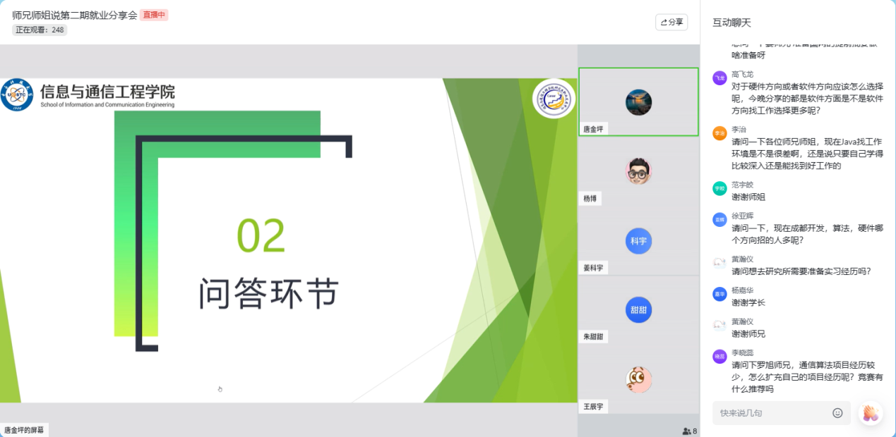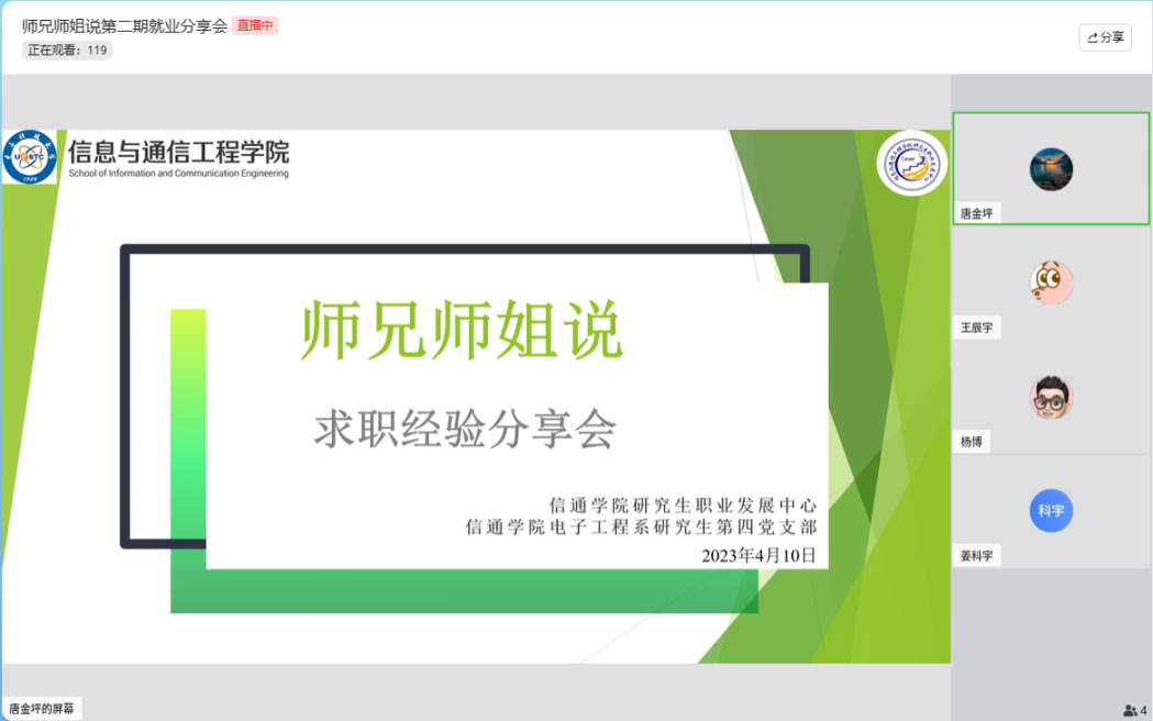 2023年4月10日晚,新葡的京集团35222vip研究生职业发展中心联合电子工程系研究生第四党支部在线上成功举办“师兄师姐说”第二期求职经验分享活动。此次活动邀请到签约国家电网、天翼云、中兴通讯、蚂蚁蓉信和中电科30所的五位应届毕业生,吸引近300名员工参与。