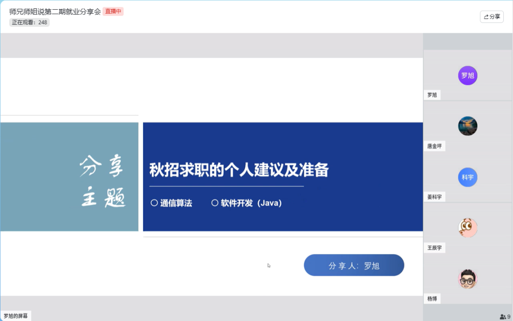 最后,签约中国电子科技集团公司第三十研究所的杨博师兄介绍了研究所的求职经验。杨师兄为同学们详尽地罗列了四川各研究所的信息,并有针对性地介绍了研究所的简历制作技巧和面试常见问题。